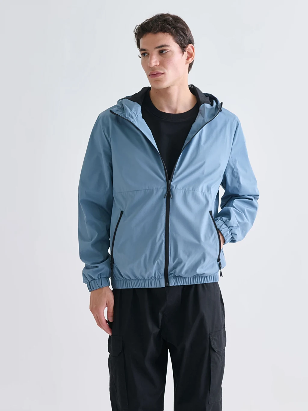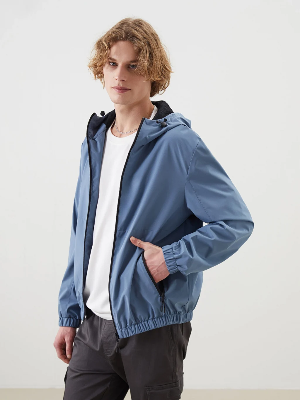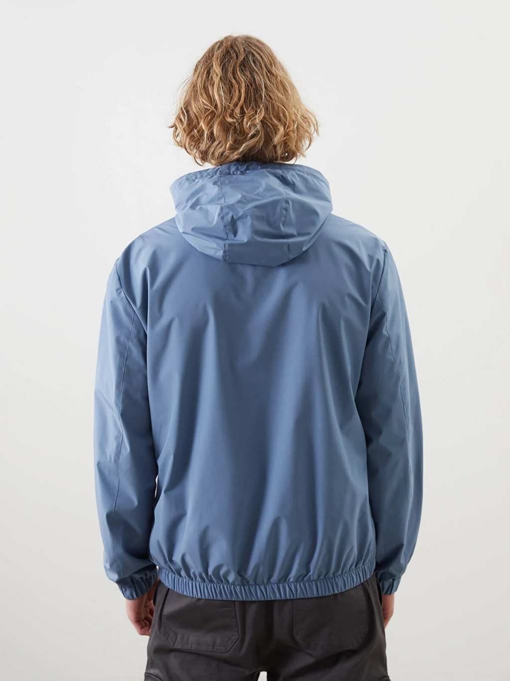 Kapüşonlu ve uzun kollu erkek yağmurluk, önden fermuar kapamalıdır. Yanlarda fermuarlı cepleri bulunur, kol ve etek ucu lastiklidir.