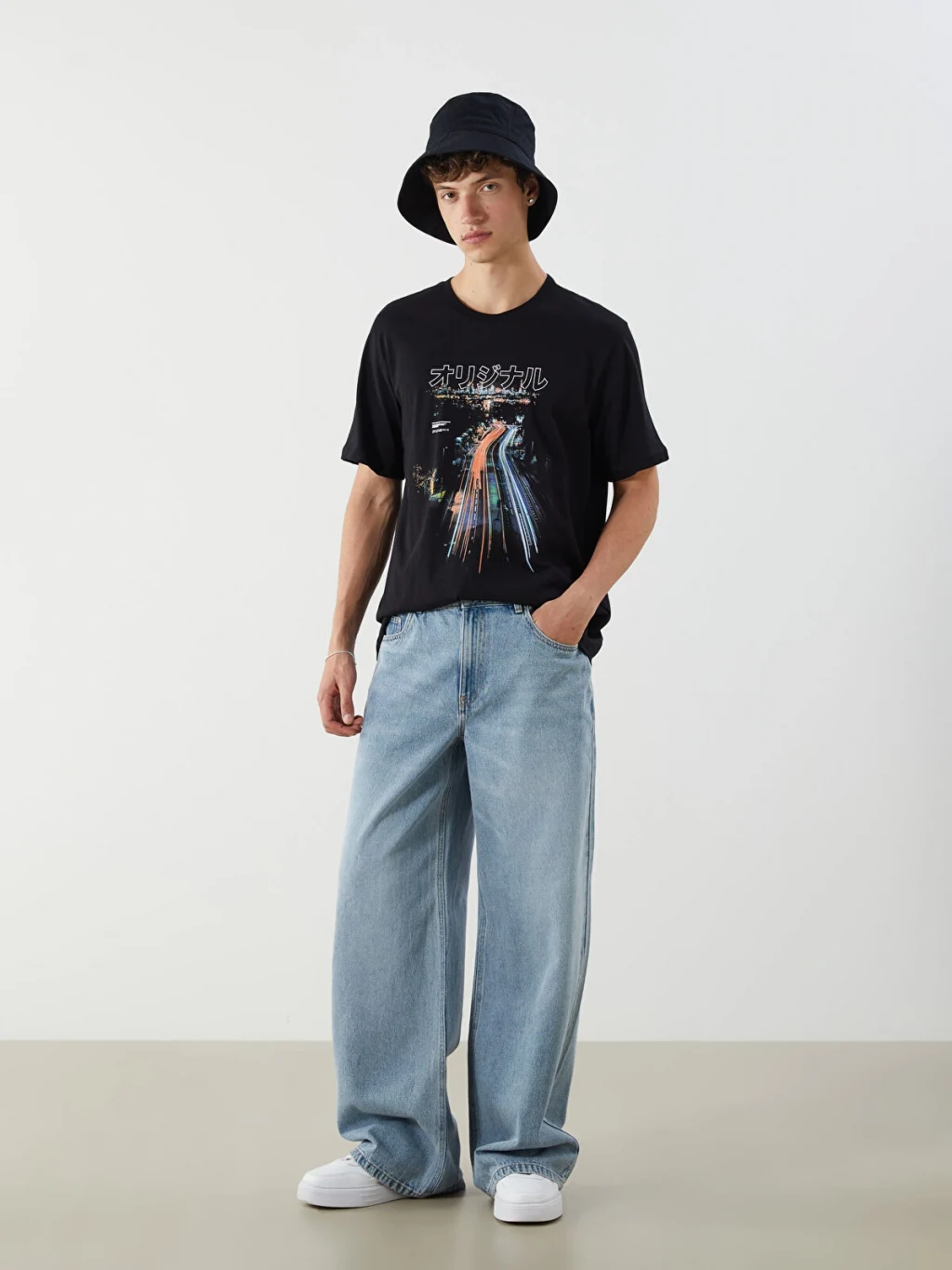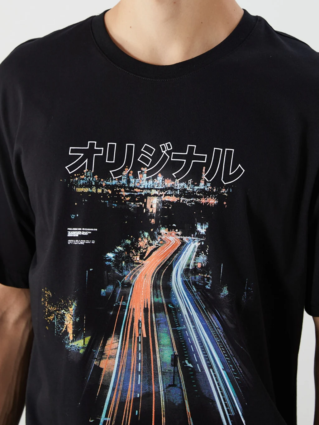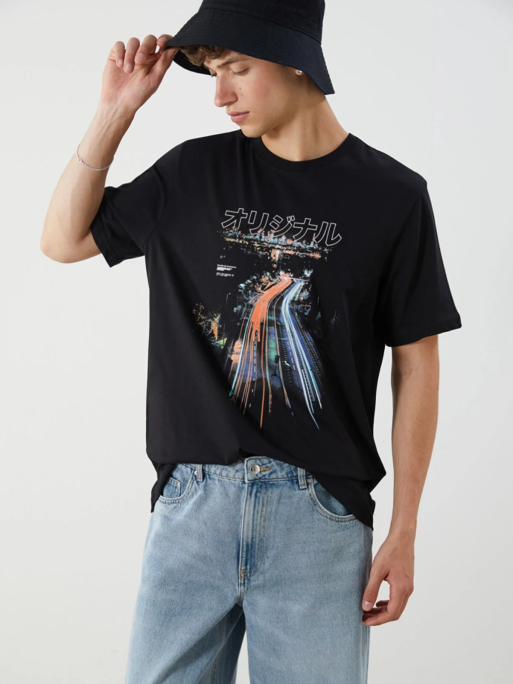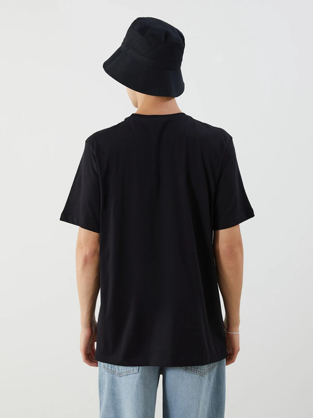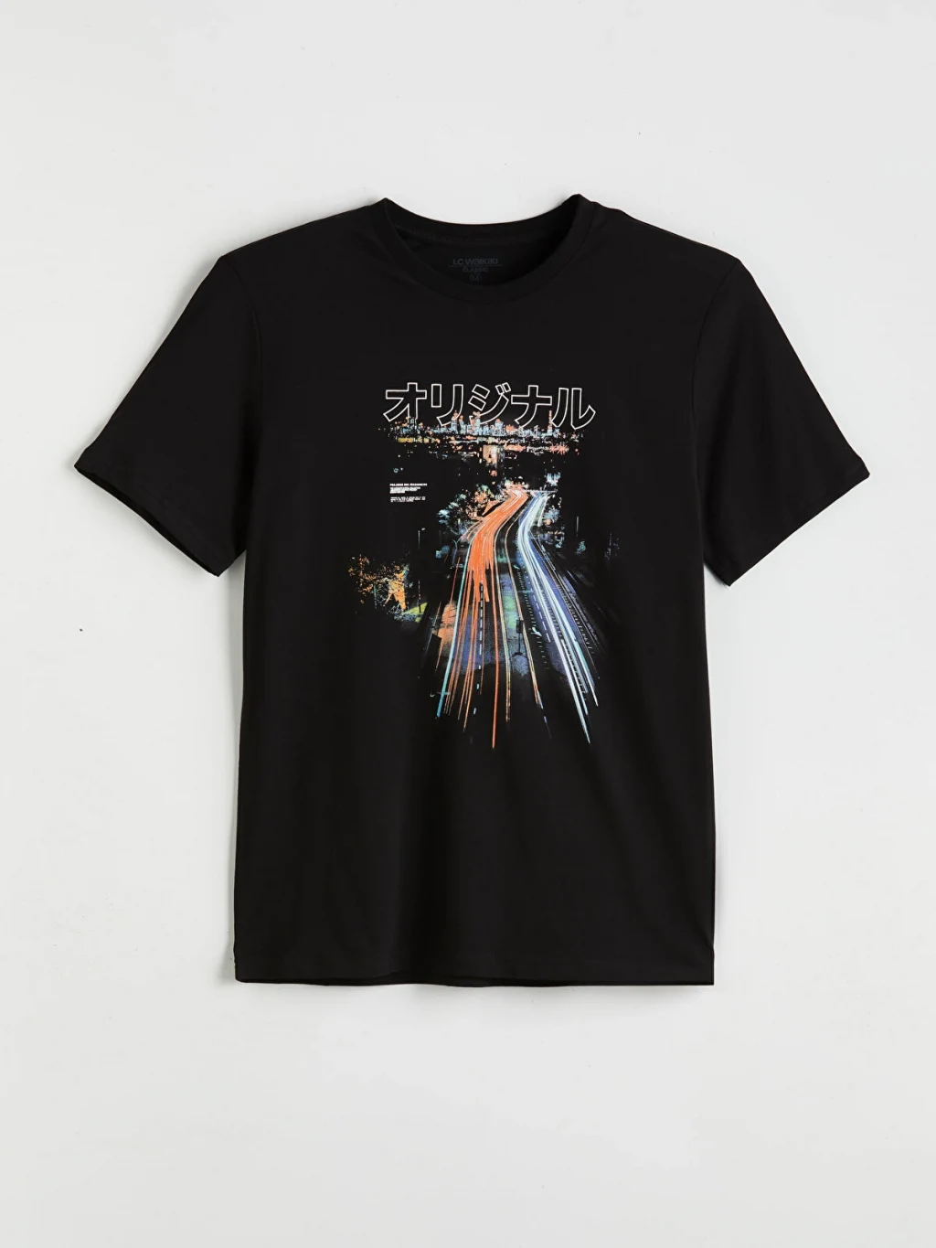 Standart kalıp, bisiklet yaka ve kısa kollu erkek tişört, %100 pamuklu penye kumaştan üretilmiştir ve önü baskılıdır.