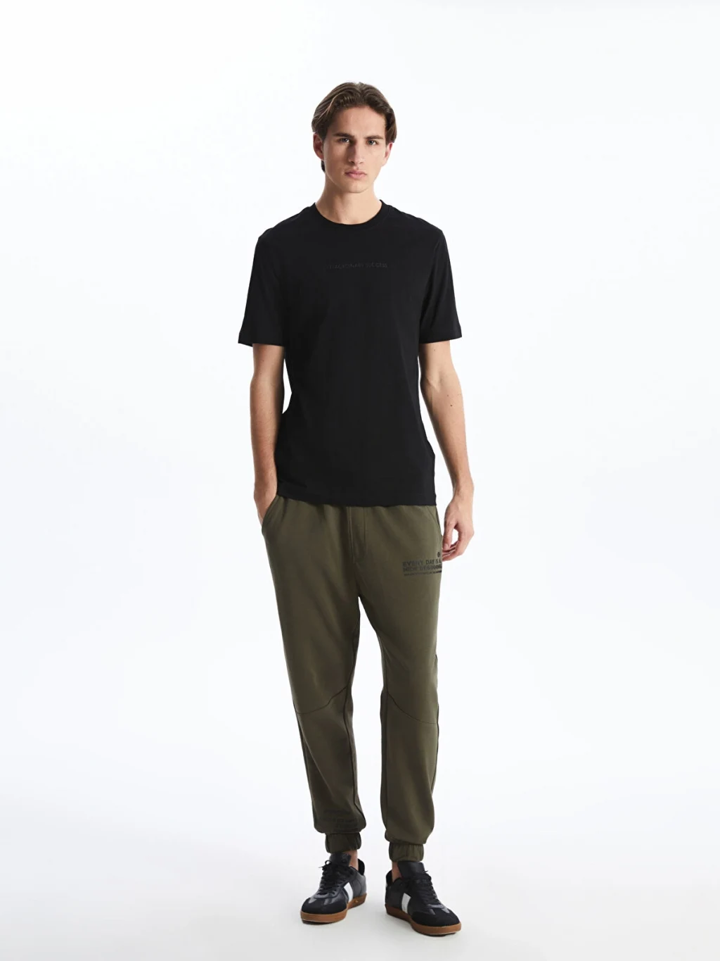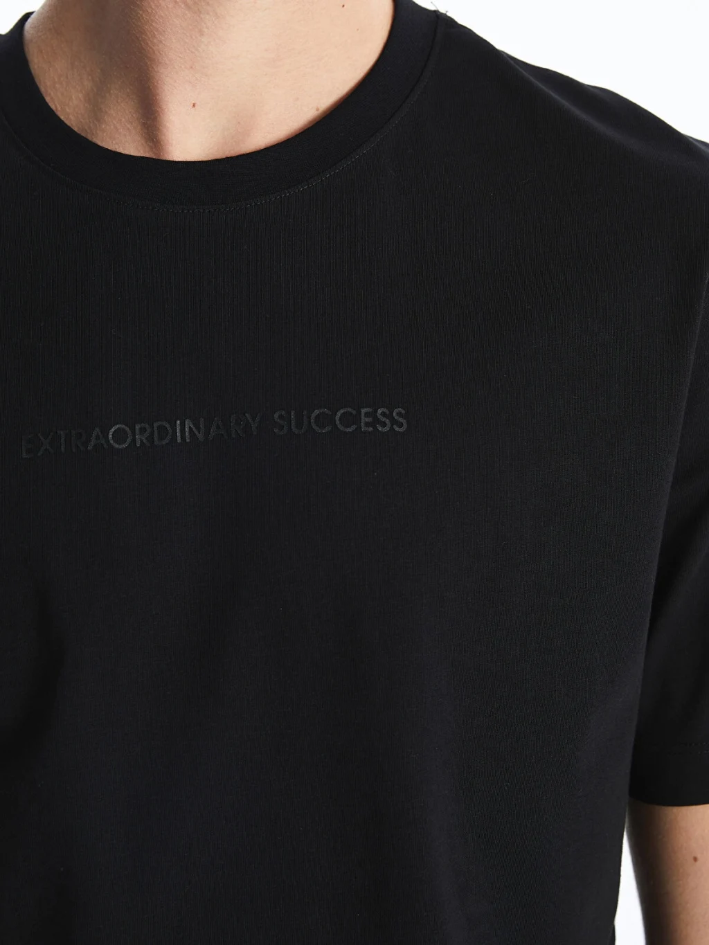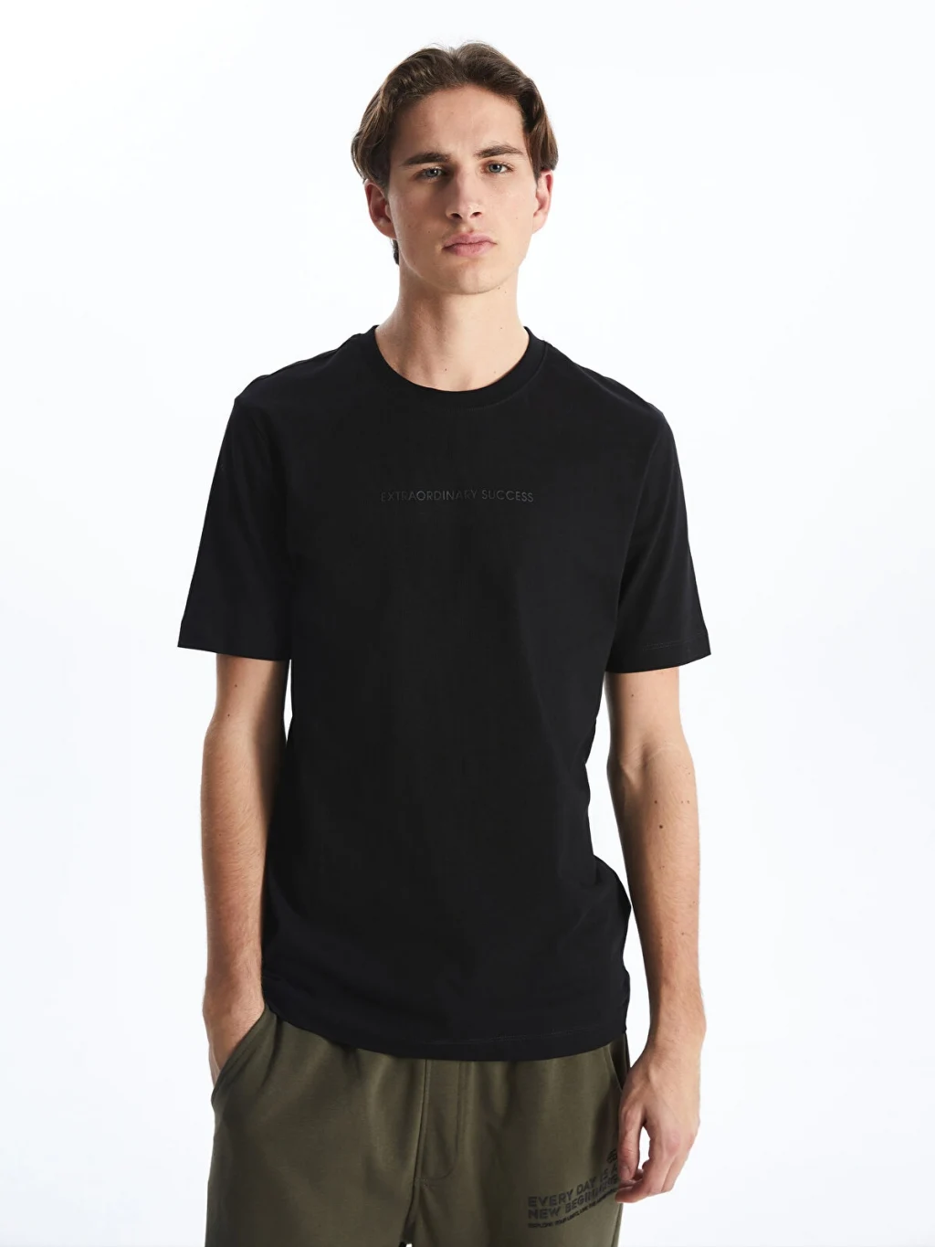 Standart kalıp, bisiklet yaka ve kısa kollu erkek tişört, %100 pamuklu penye kumaştan üretilmiştir. Göğüs kısmında yazı detayı bulunur.