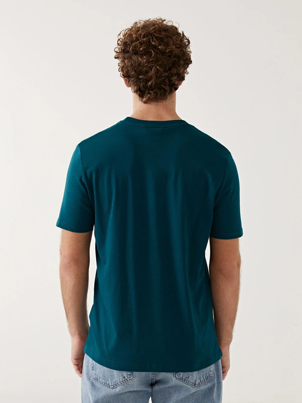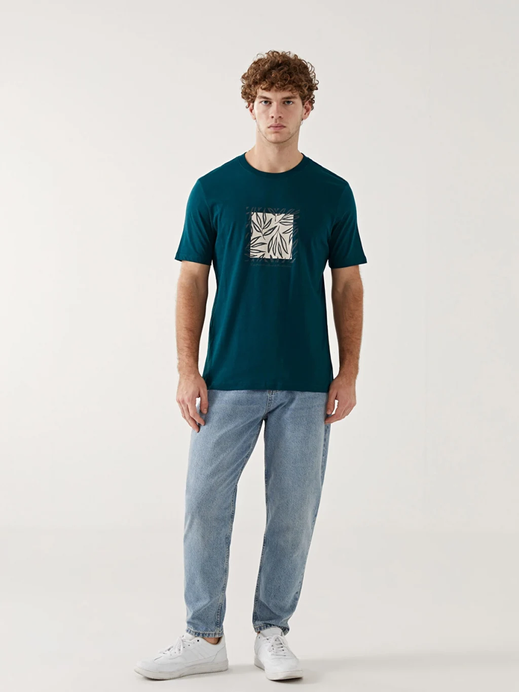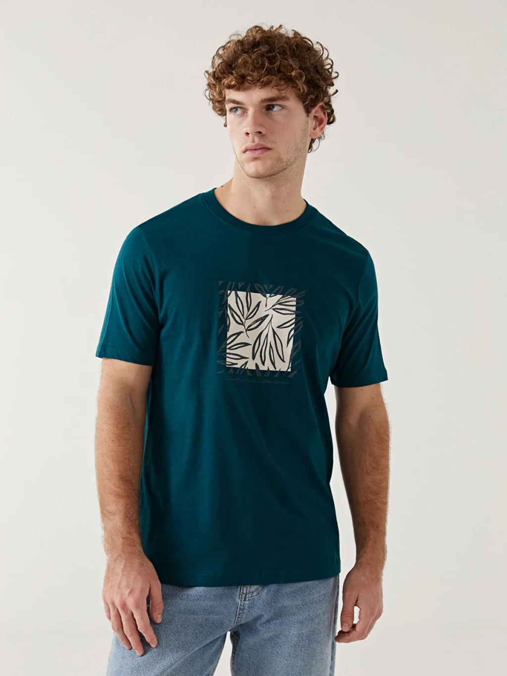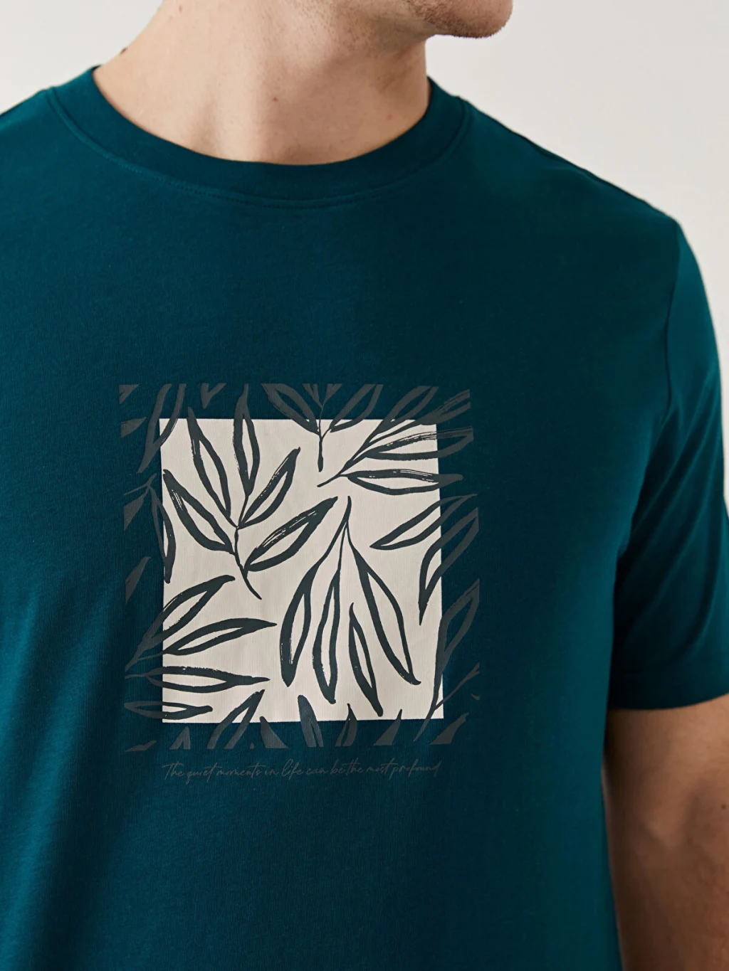 Standart kalıp, bisiklet yaka ve kısa kollu erkek tişört, %100 pamuklu penye kumaştan üretilmiştir. Önünde yaprak desenli baskı bulunur.