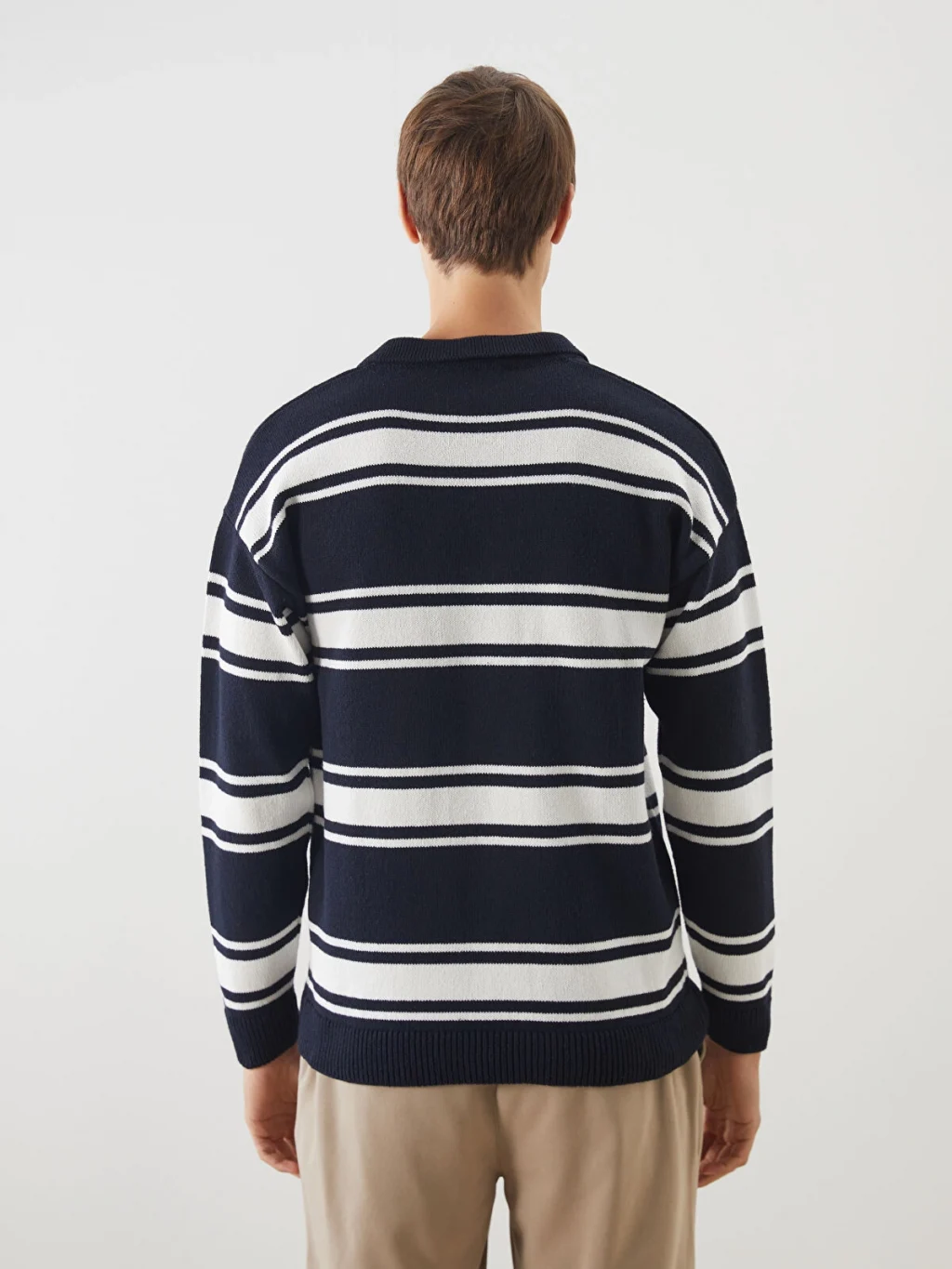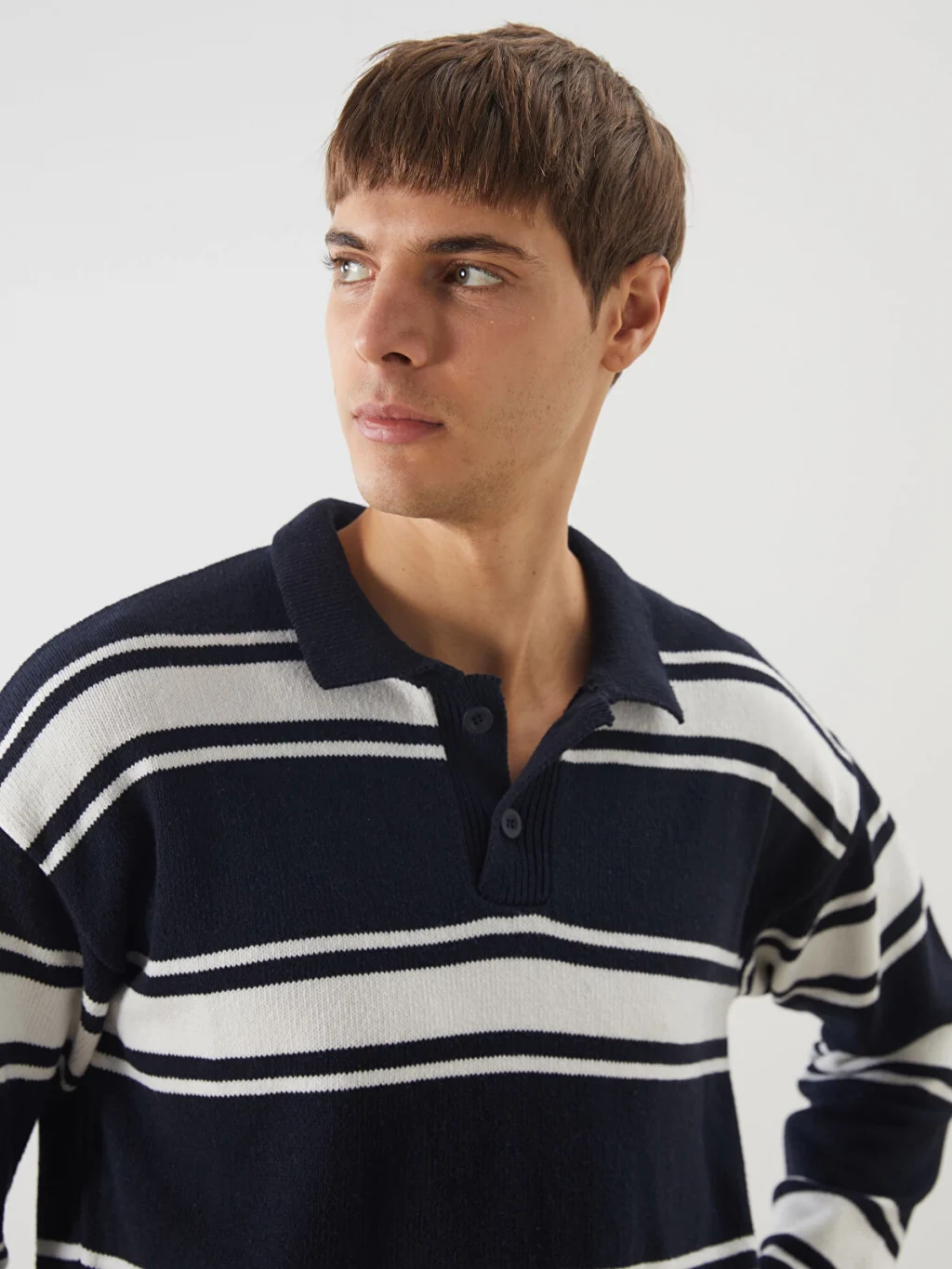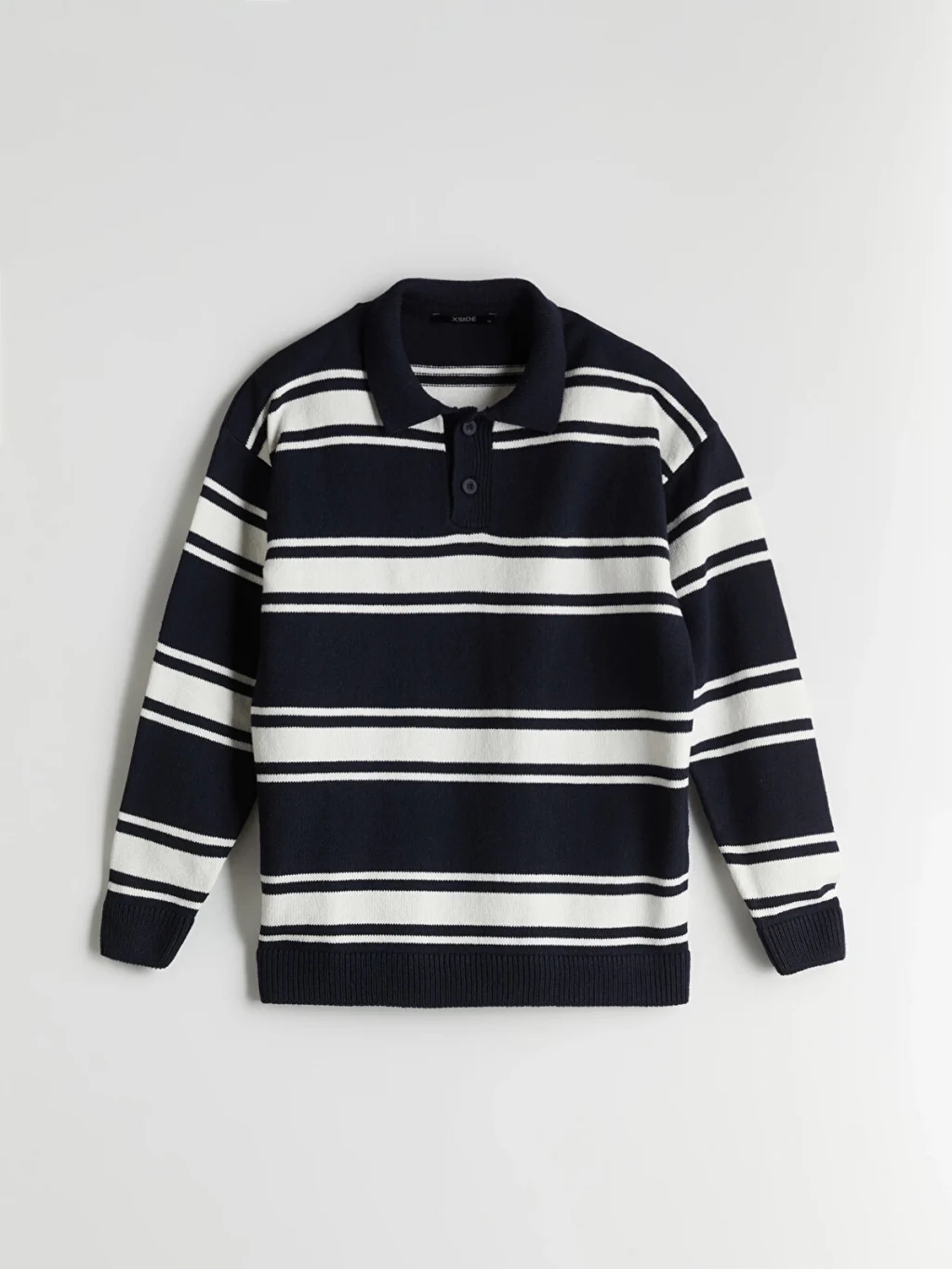 XSIDE Lacivert Polo Yaka Çizgili Erkek Triko Kazak