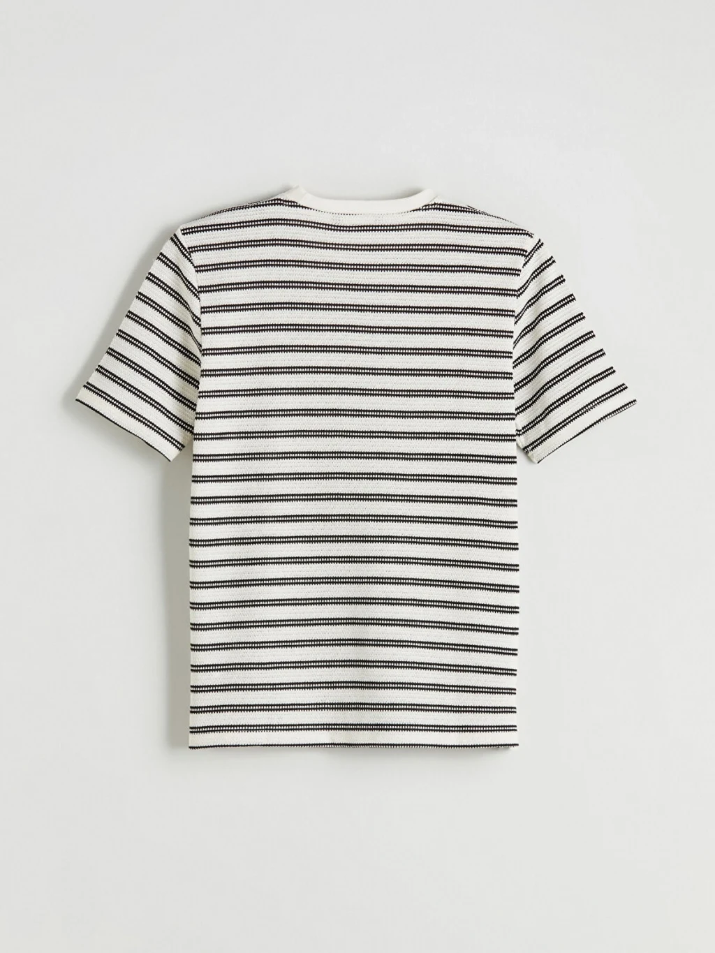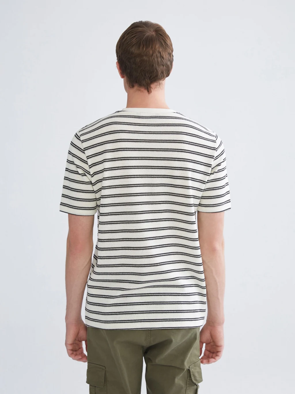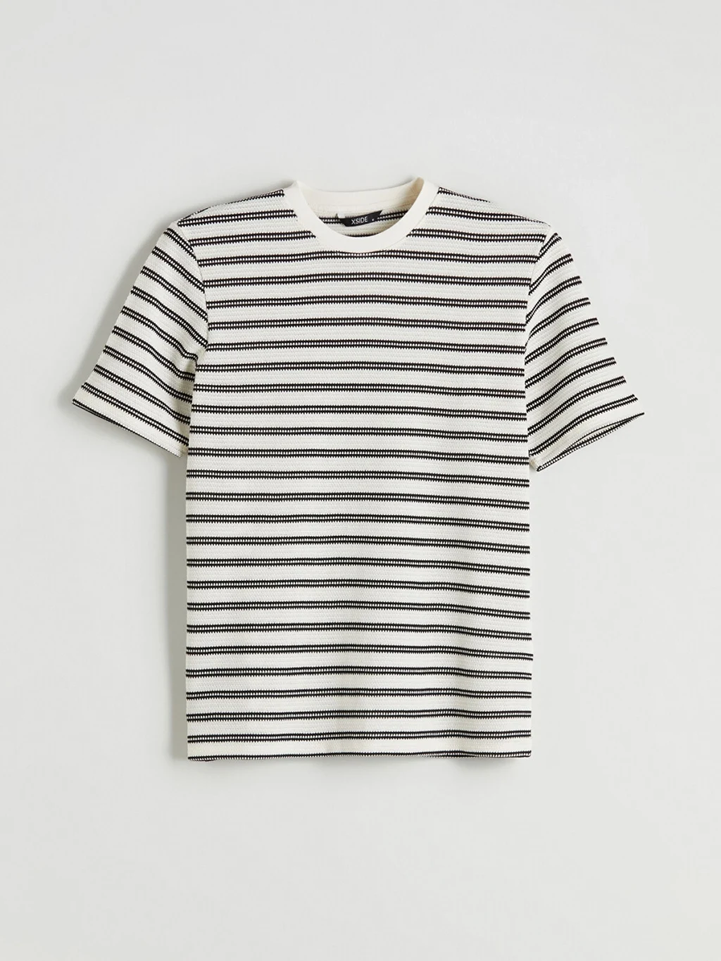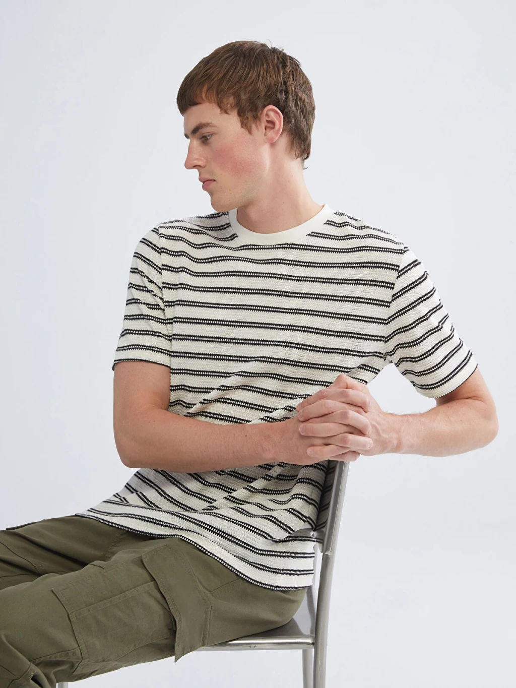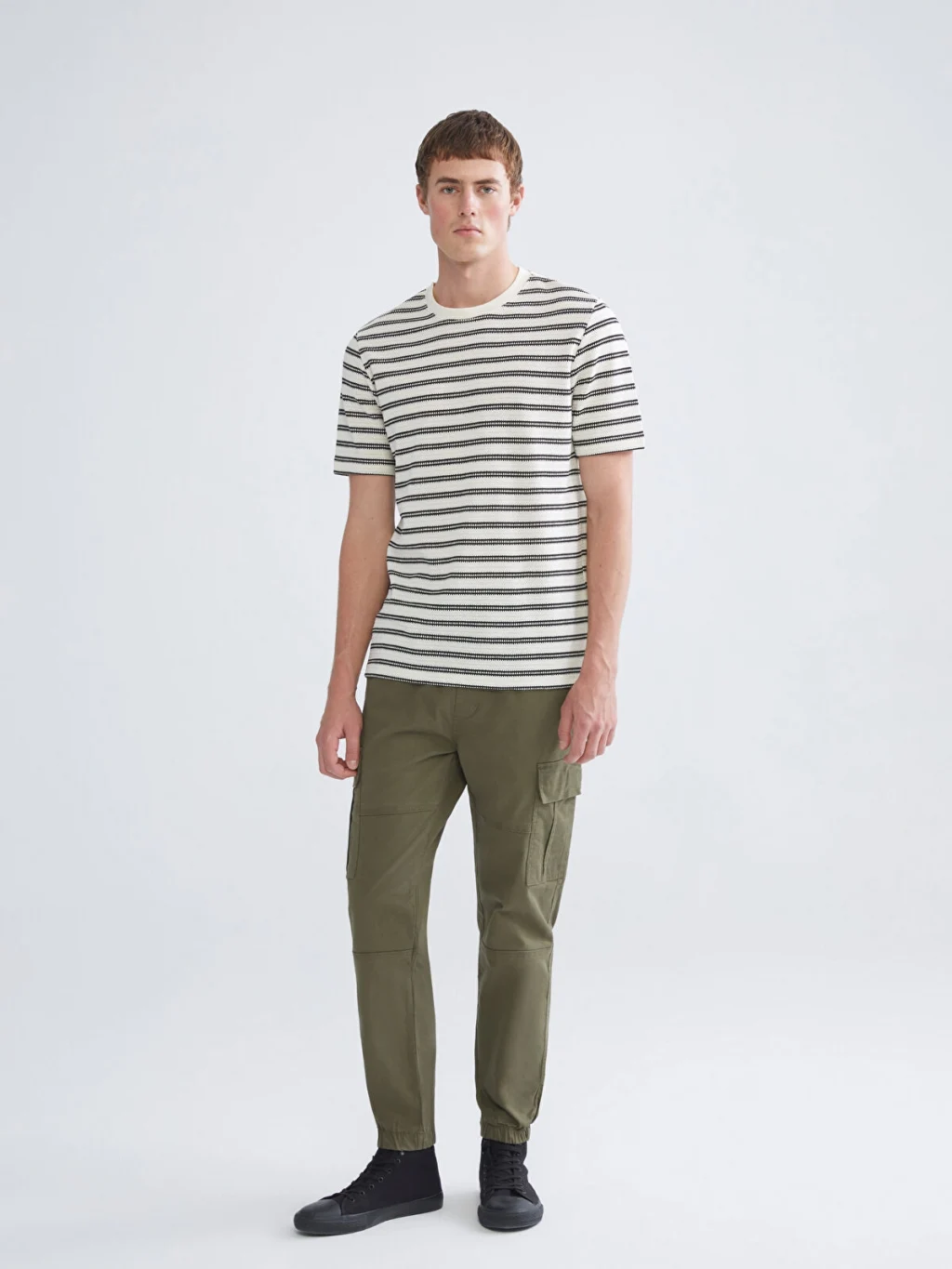 Standart kalıp erkek tişört, penye kumaştan üretilmiştir. Bisiklet yakalı, kısa kollu ve çizgili desenlidir.