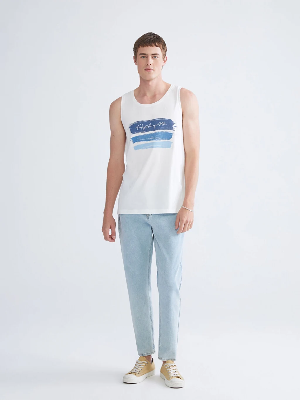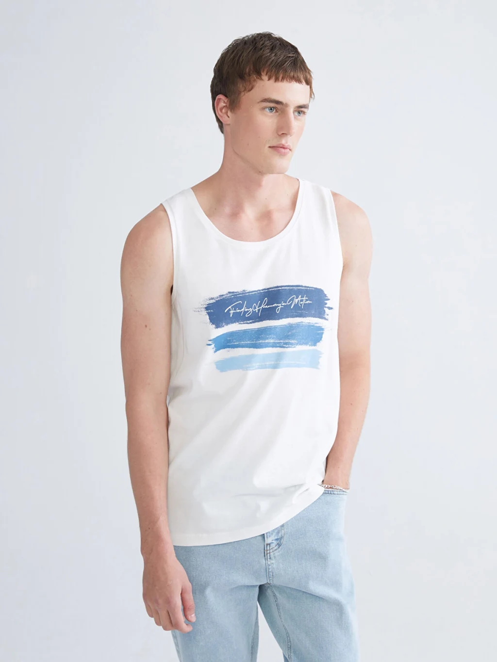 Standart kalıplı, bisiklet yaka erkek atlet, kolsuzdur ve önü baskılıdır. %100 pamuklu kumaştan üretilmiştir.