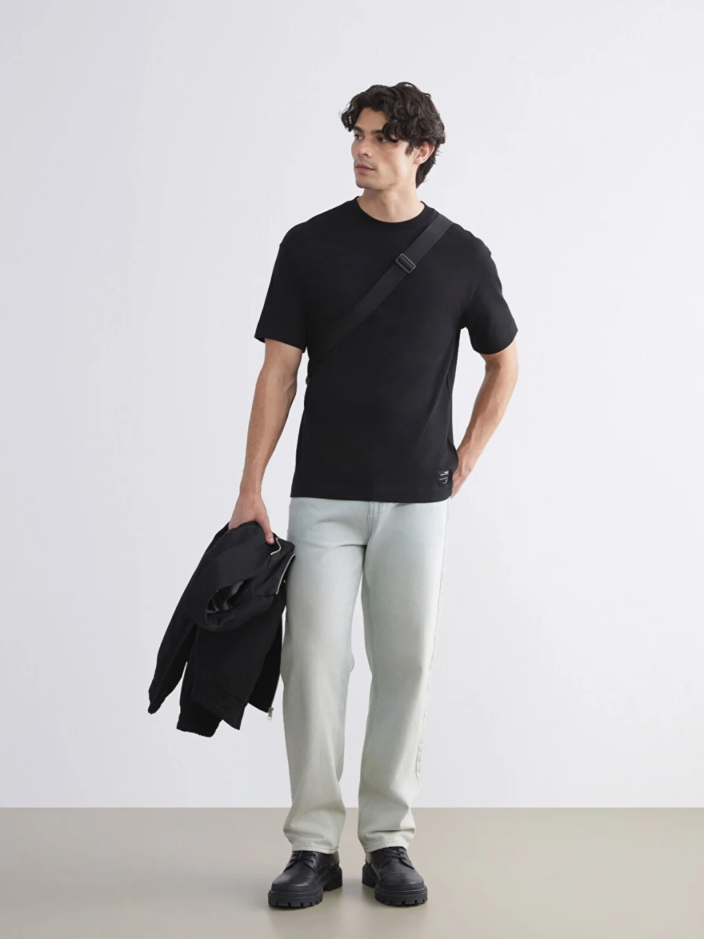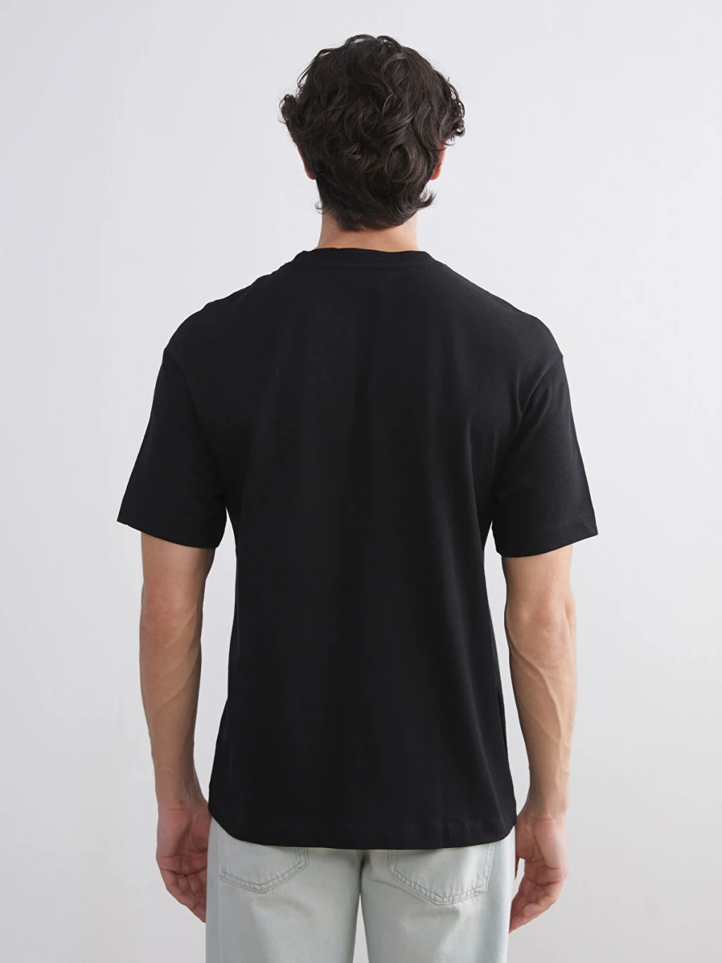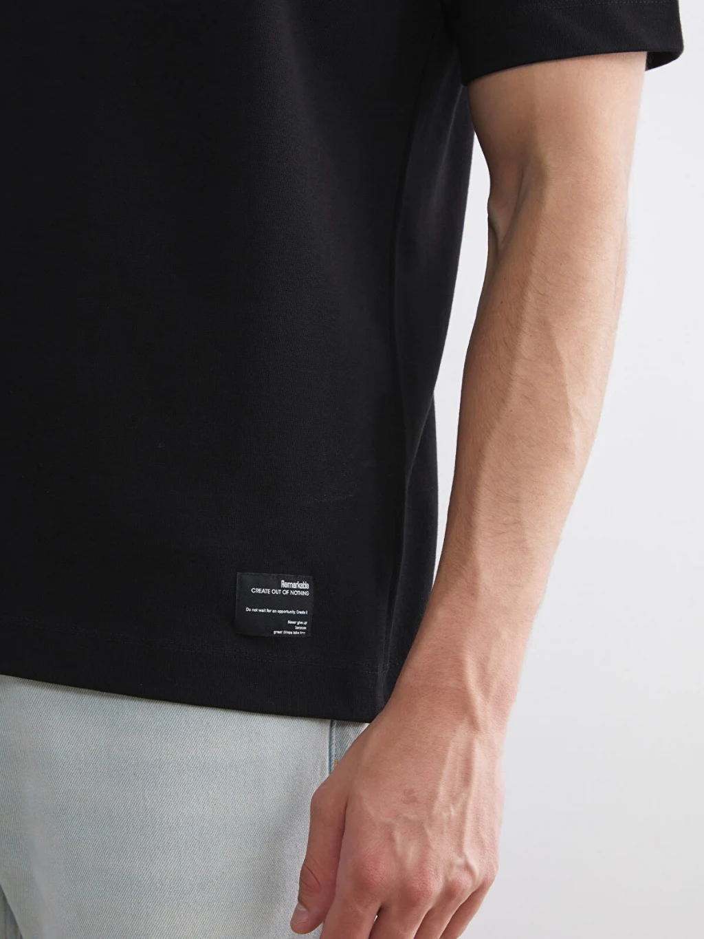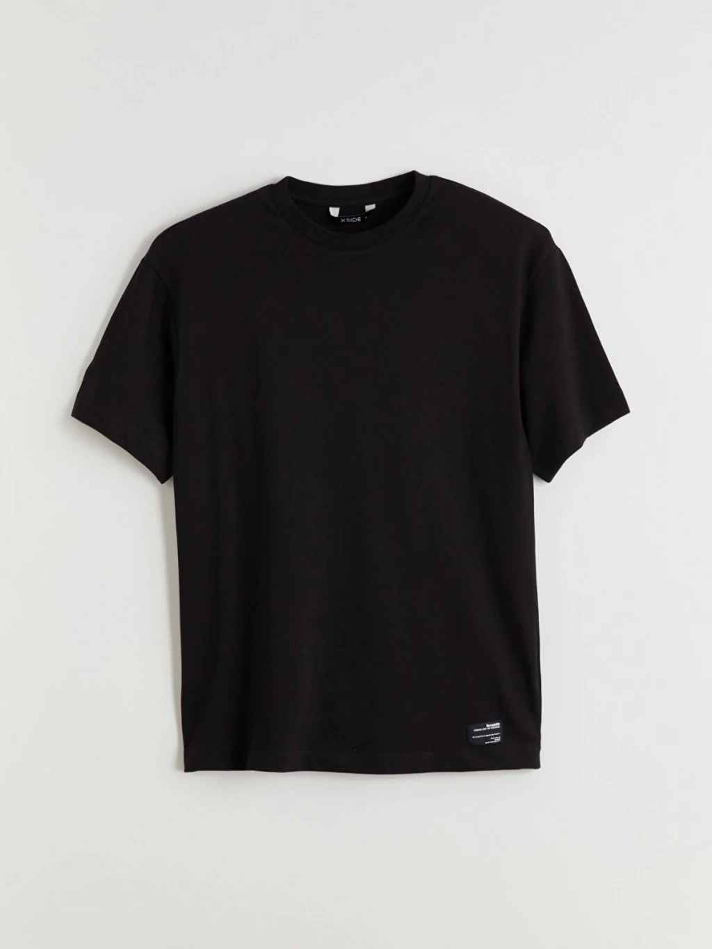 Bisiklet yaka, kısa kollu erkek tişört, %100 pamuk kumaştan üretilmiştir. Standart kalıplı ürünün etek ucunda etiket detayı bulunur.
