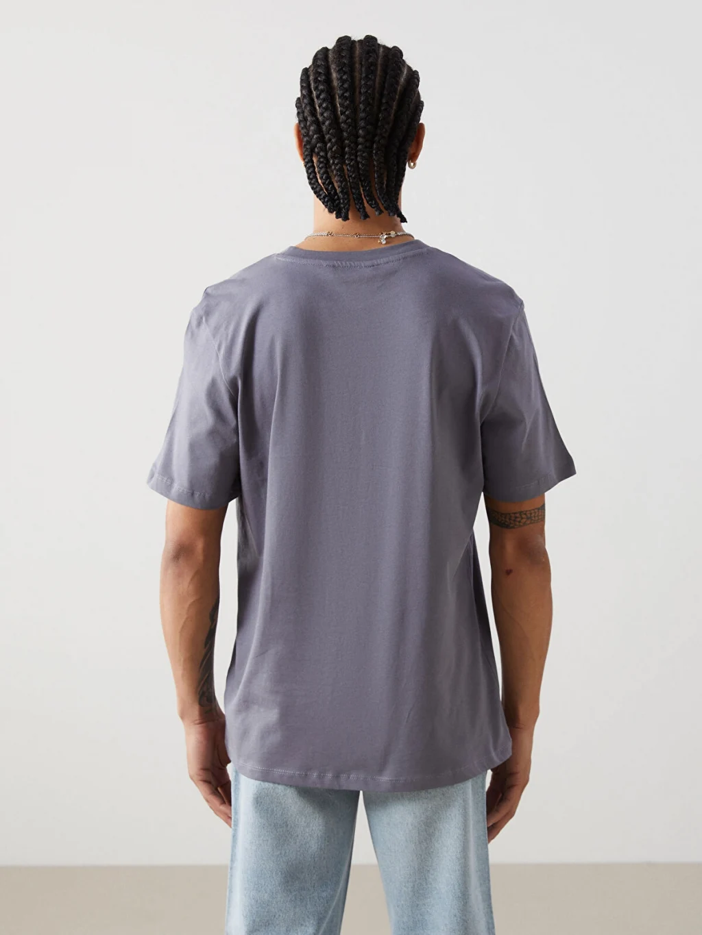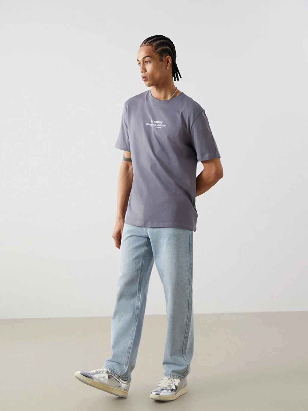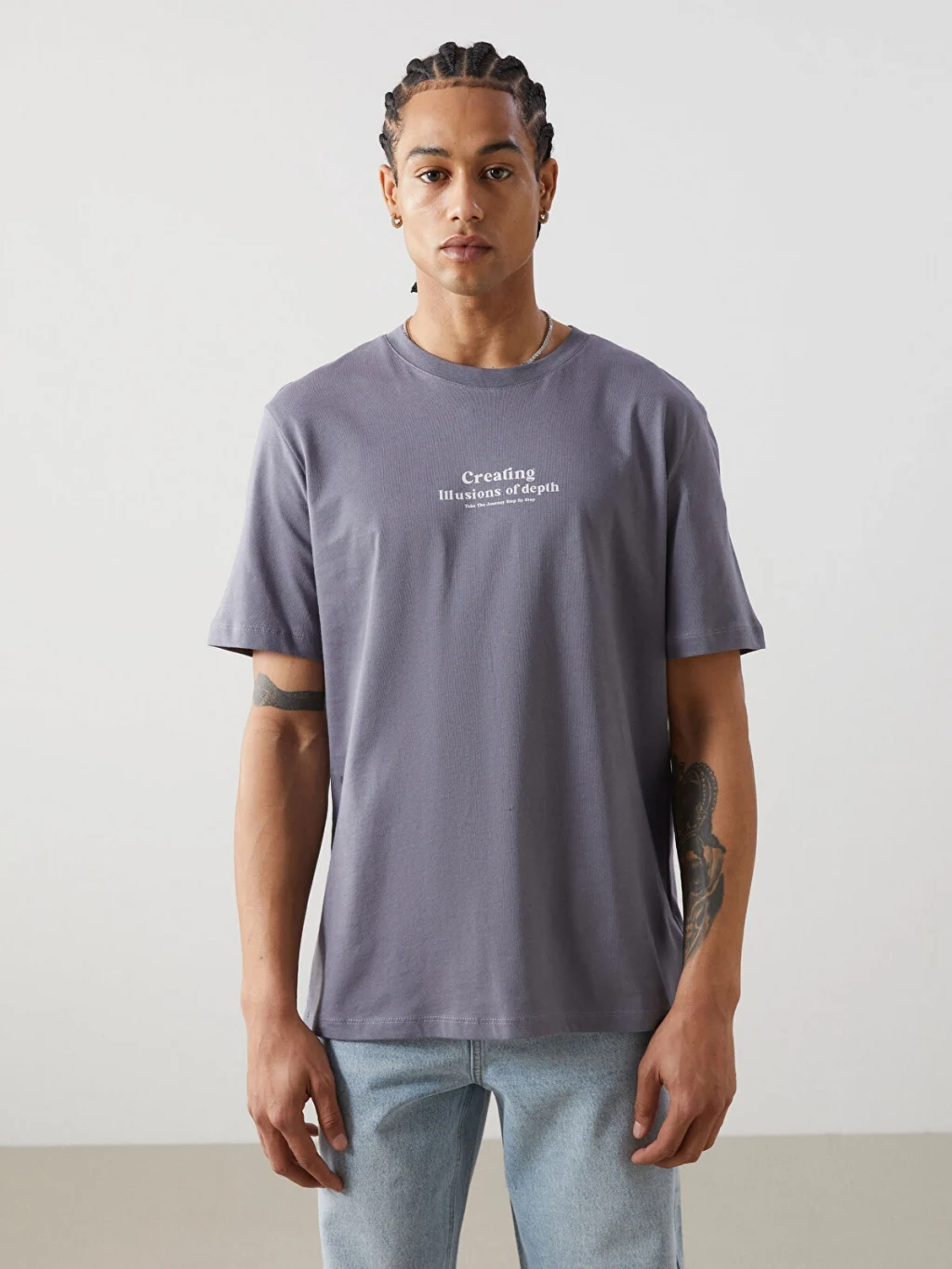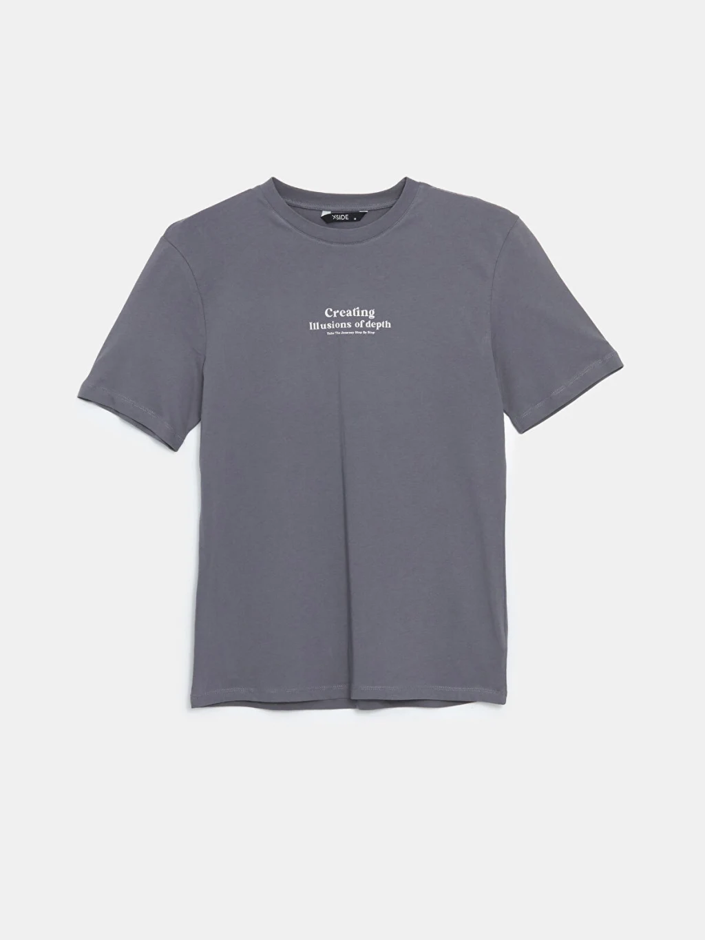 Standart kalıp erkek tişört, %100 pamuklu penye kumaştan üretilmiştir. Bisiklet yakalı, kısa kollu ve önü yazı baskılıdır.