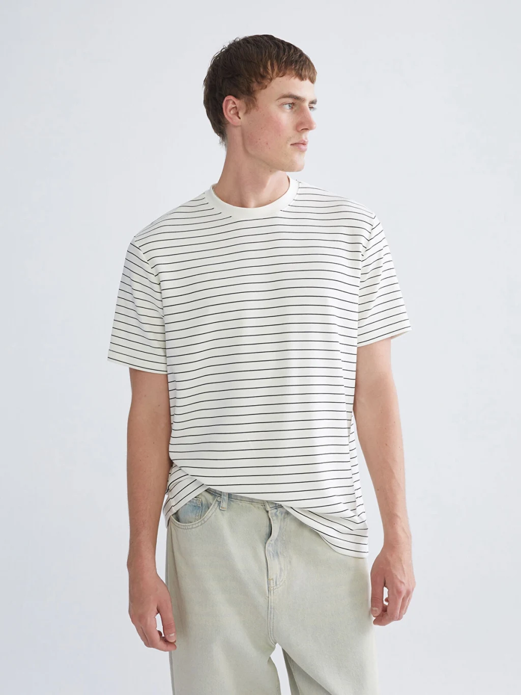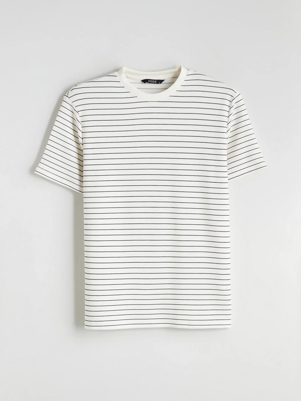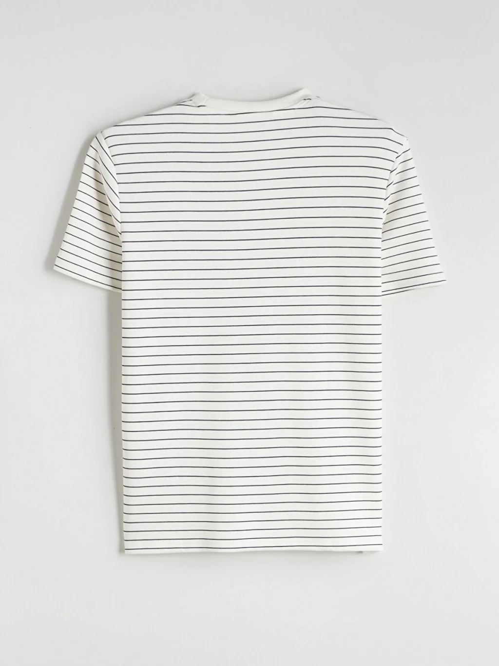 Standart kalıp, çizgili desenli erkek tişört, bisiklet yaka ve kısa kolludur. İnterlok kumaştan üretilmiştir.