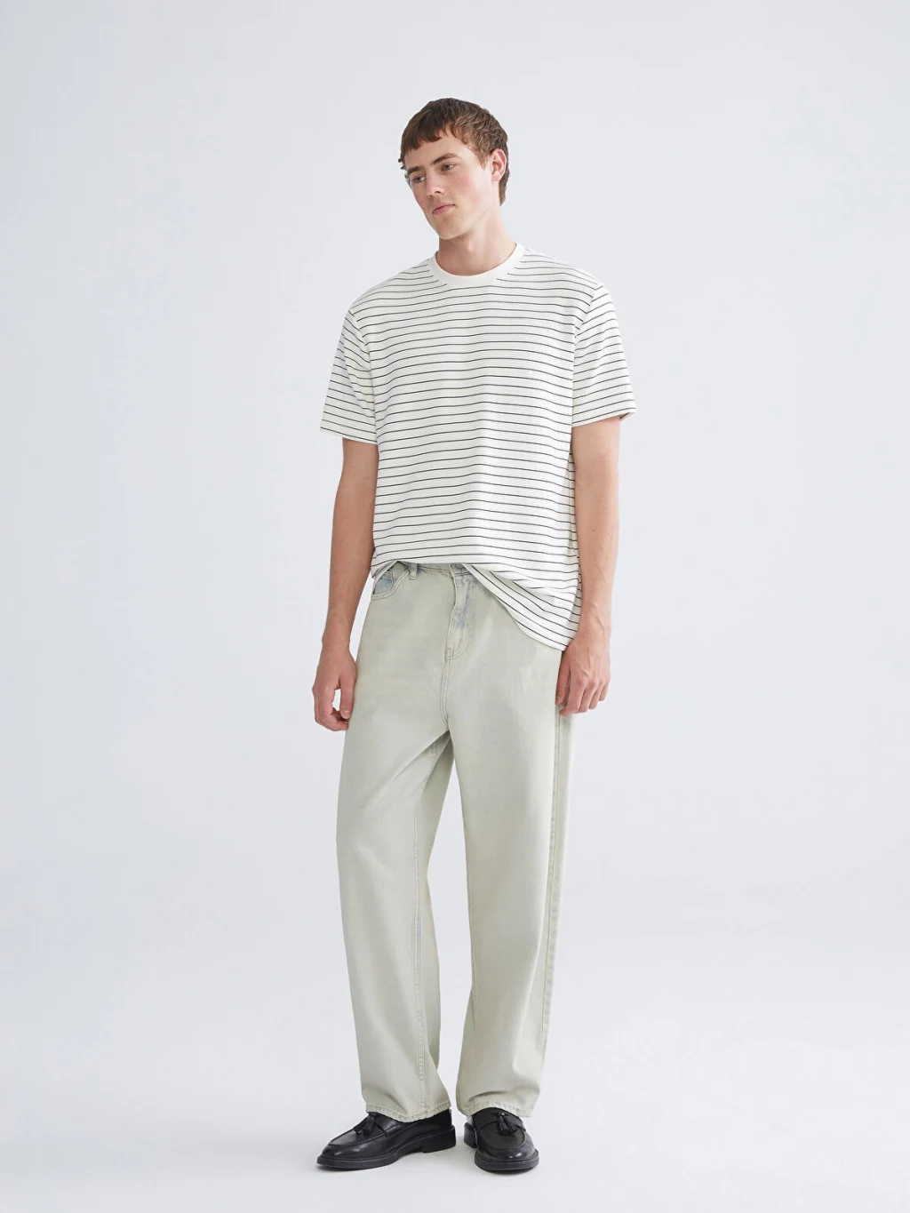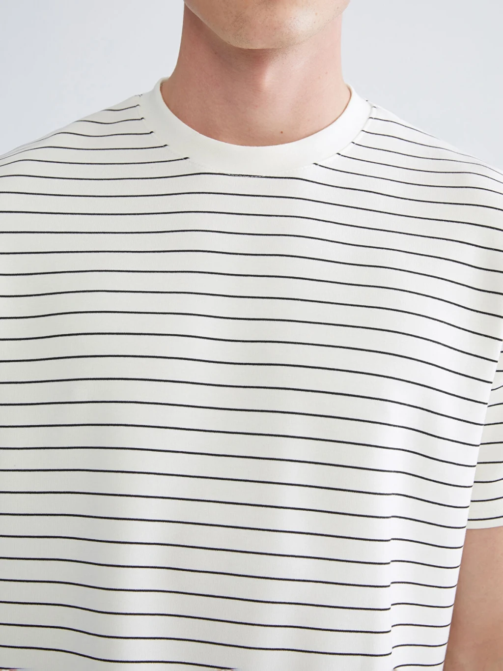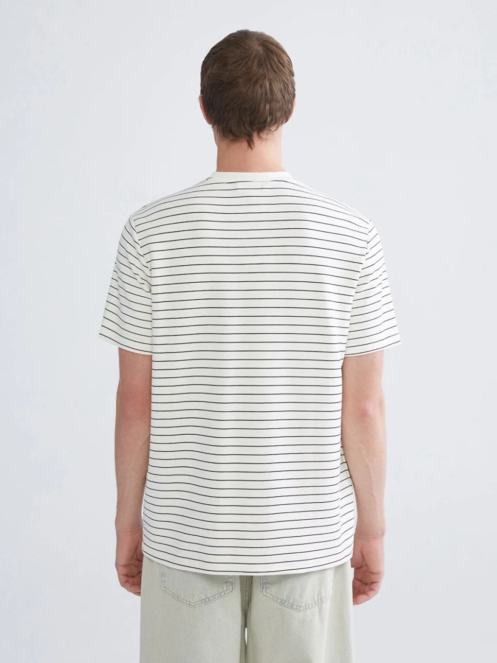 Standart kalıp, çizgili desenli erkek tişört, bisiklet yaka ve kısa kolludur. İnterlok kumaştan üretilmiştir.