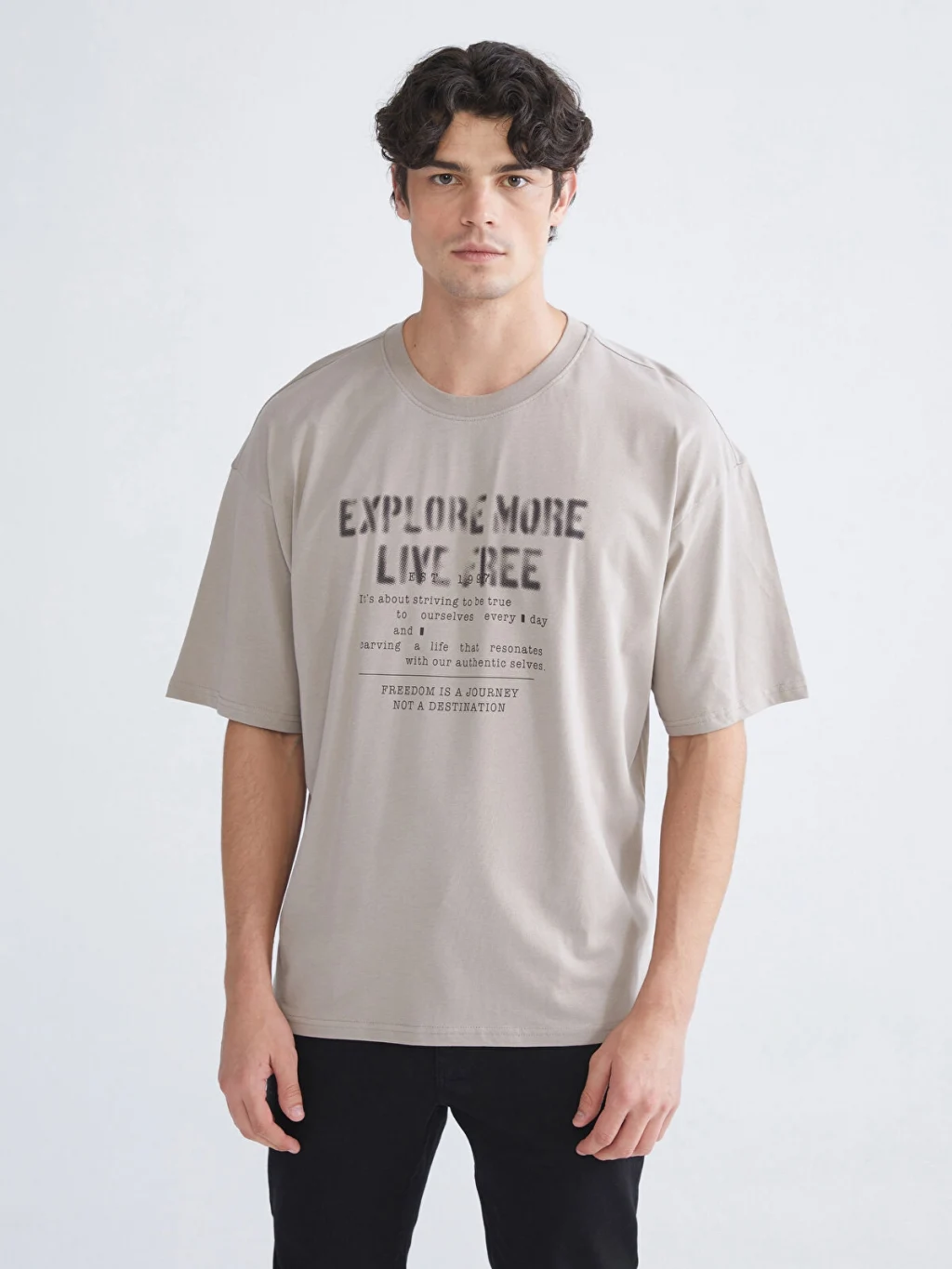 Bisiklet yaka tasarıma sahip olan erkek tişört, kısa kolludur. Penye kumaştan üretilmiş olup baskı detaylarıyla tamamlanmıştır.