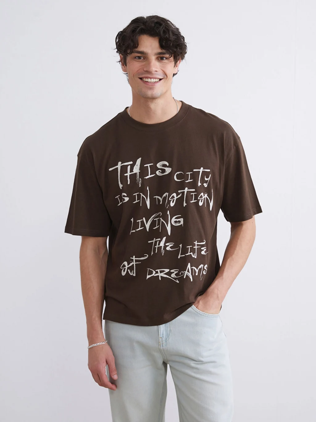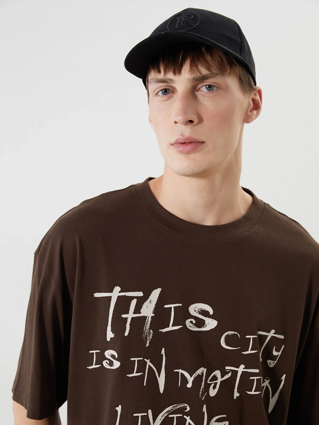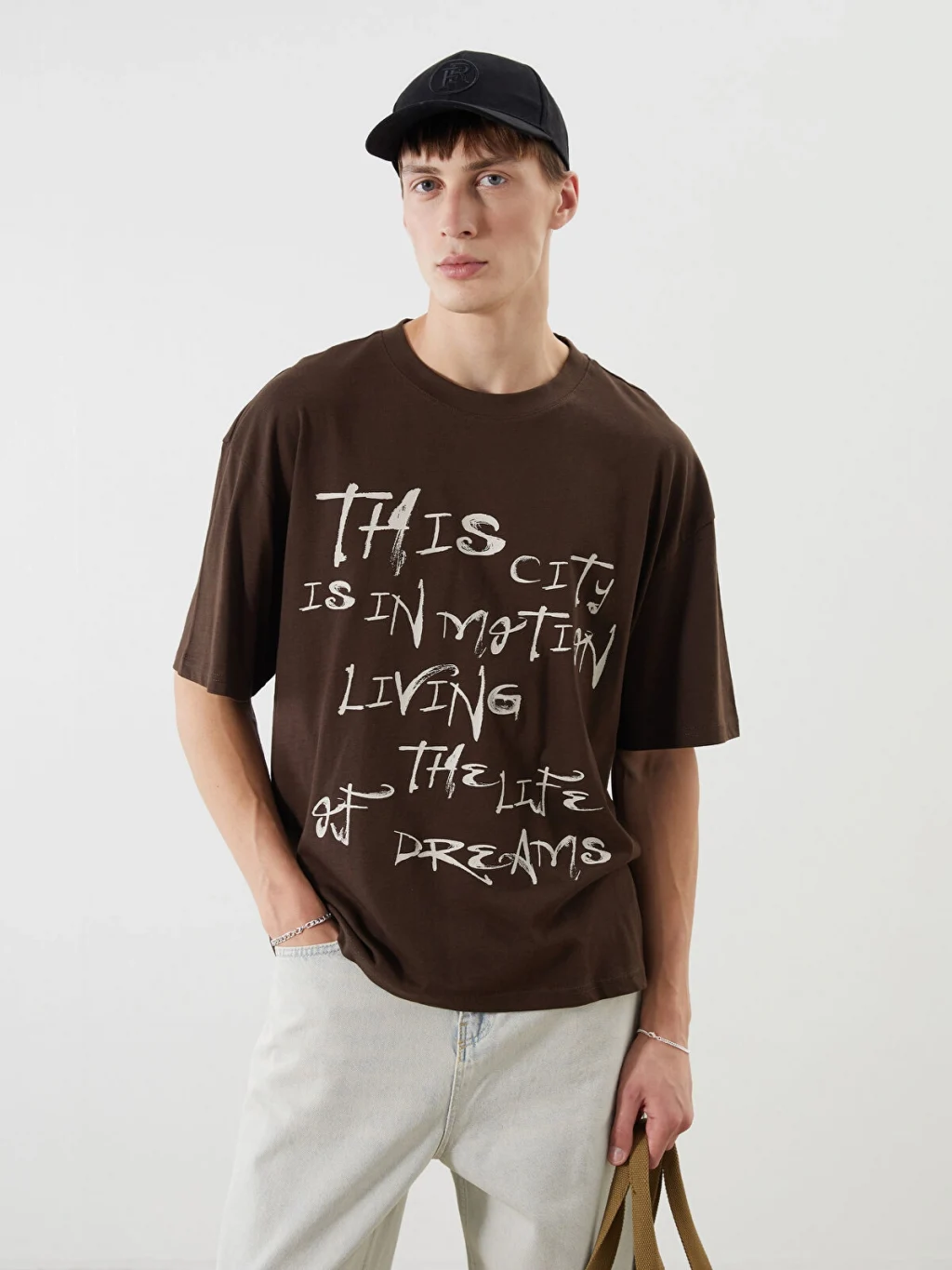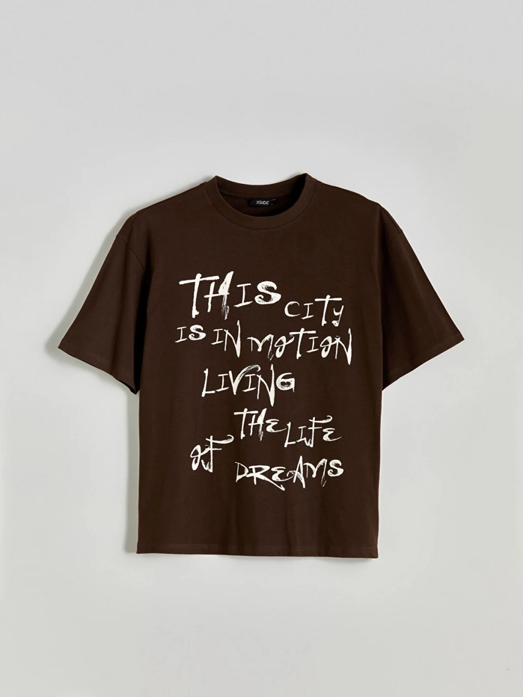 Bisiklet yakalı, kısa kollu ve önü yazı baskılı erkek tişört, bol kalıplıdır ve penye kumaştan üretilmiştir.
