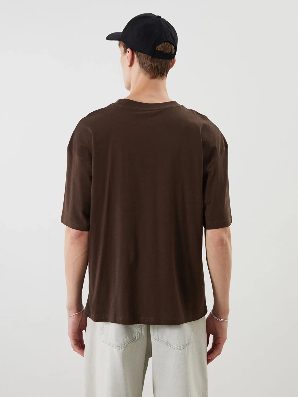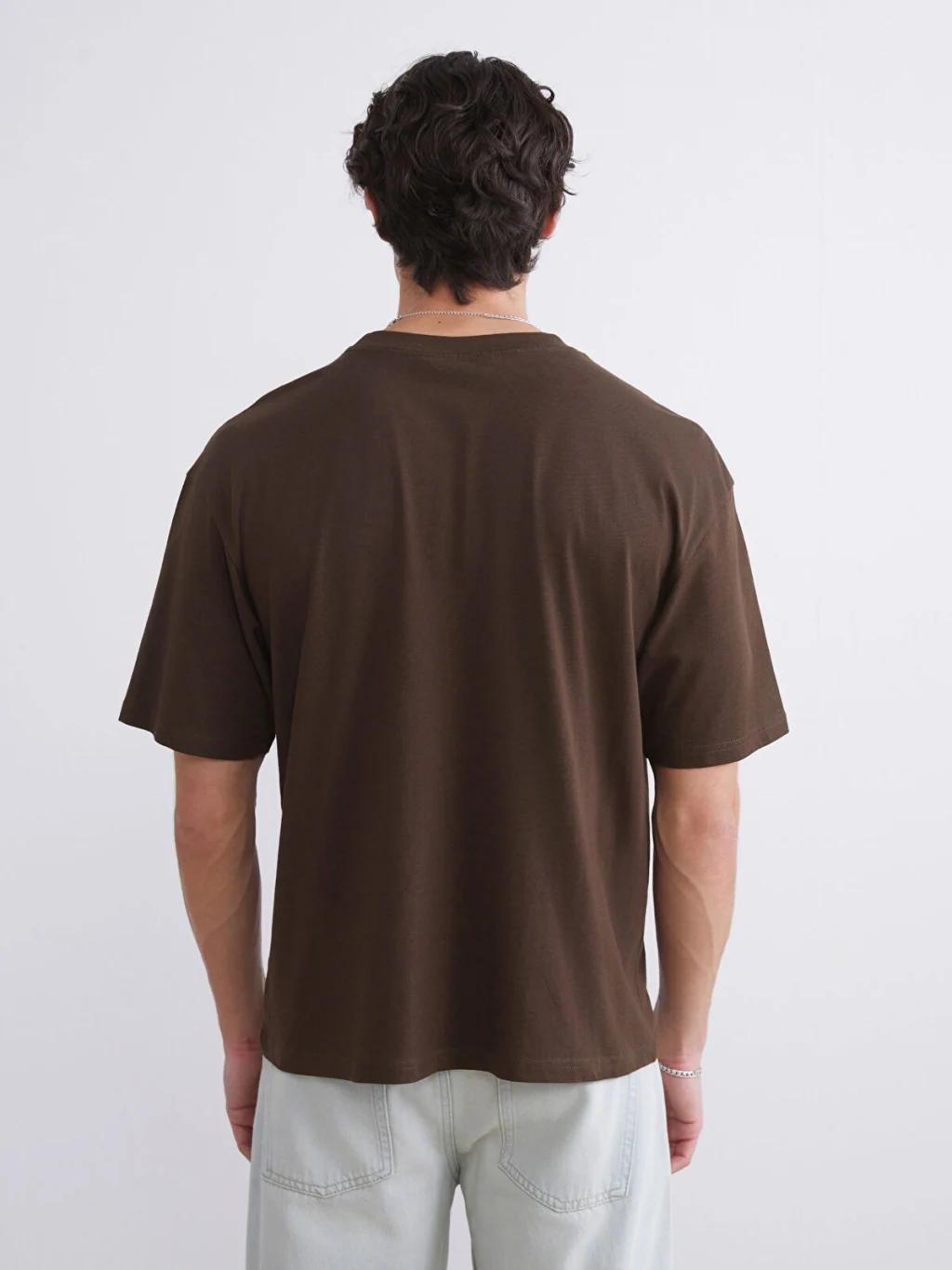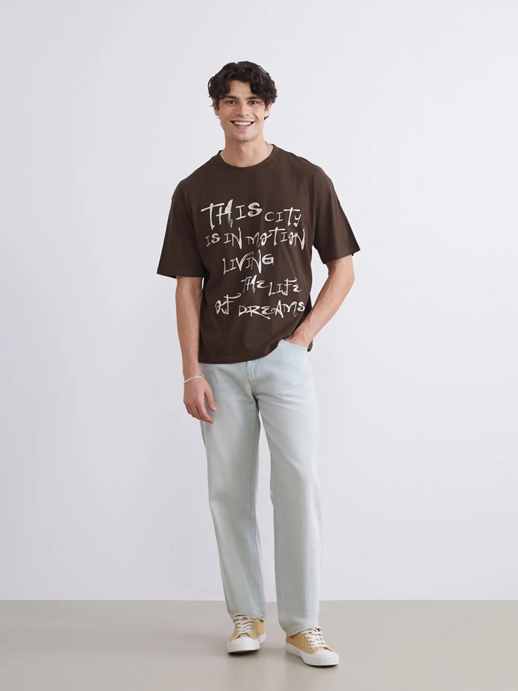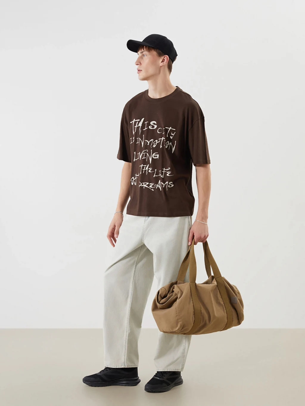 Bisiklet yakalı, kısa kollu ve önü yazı baskılı erkek tişört, bol kalıplıdır ve penye kumaştan üretilmiştir.