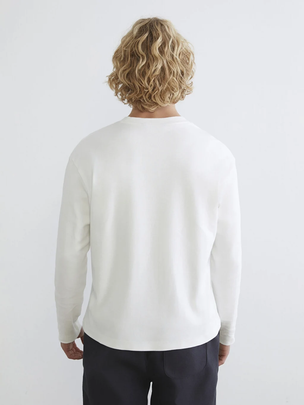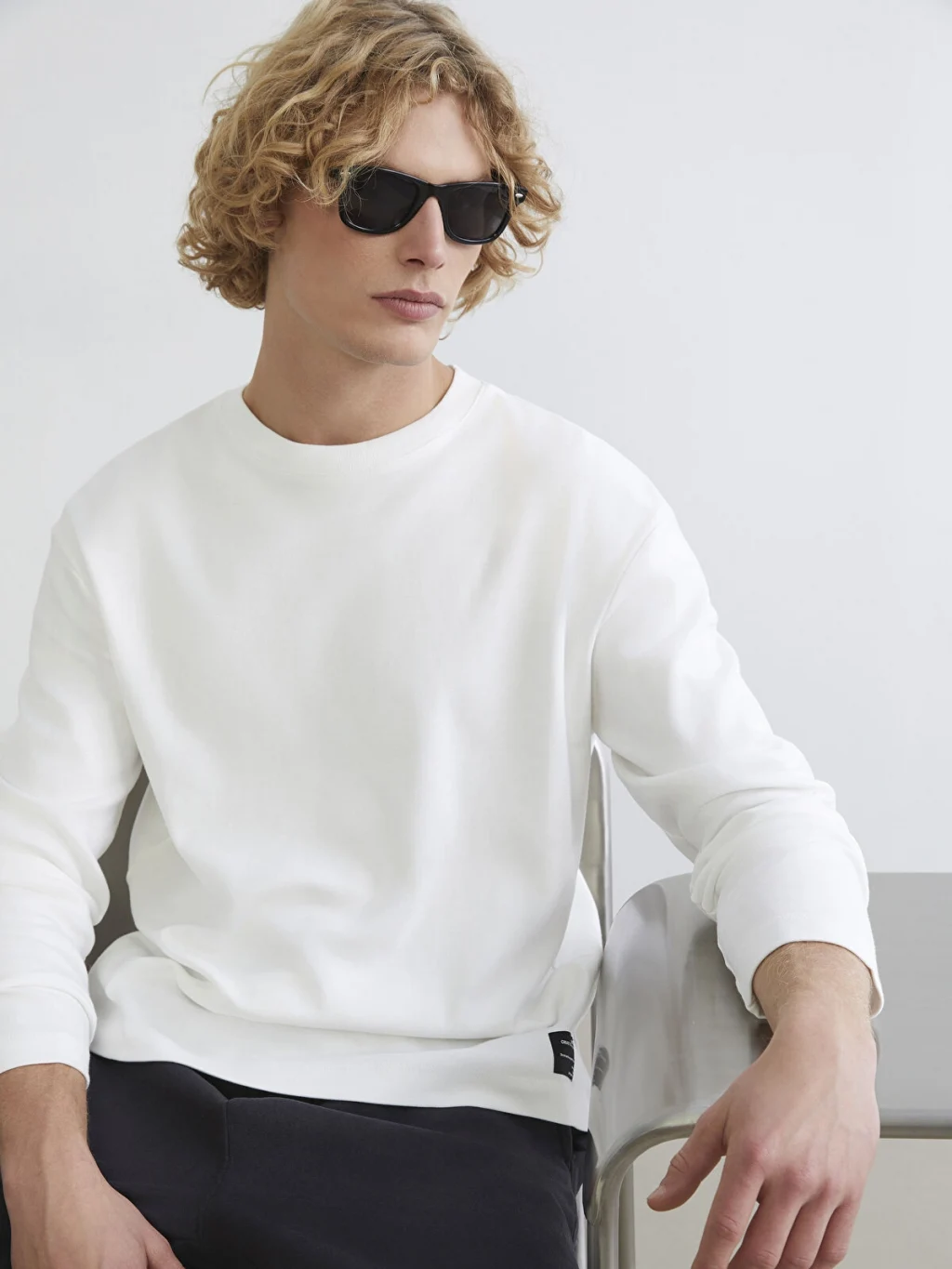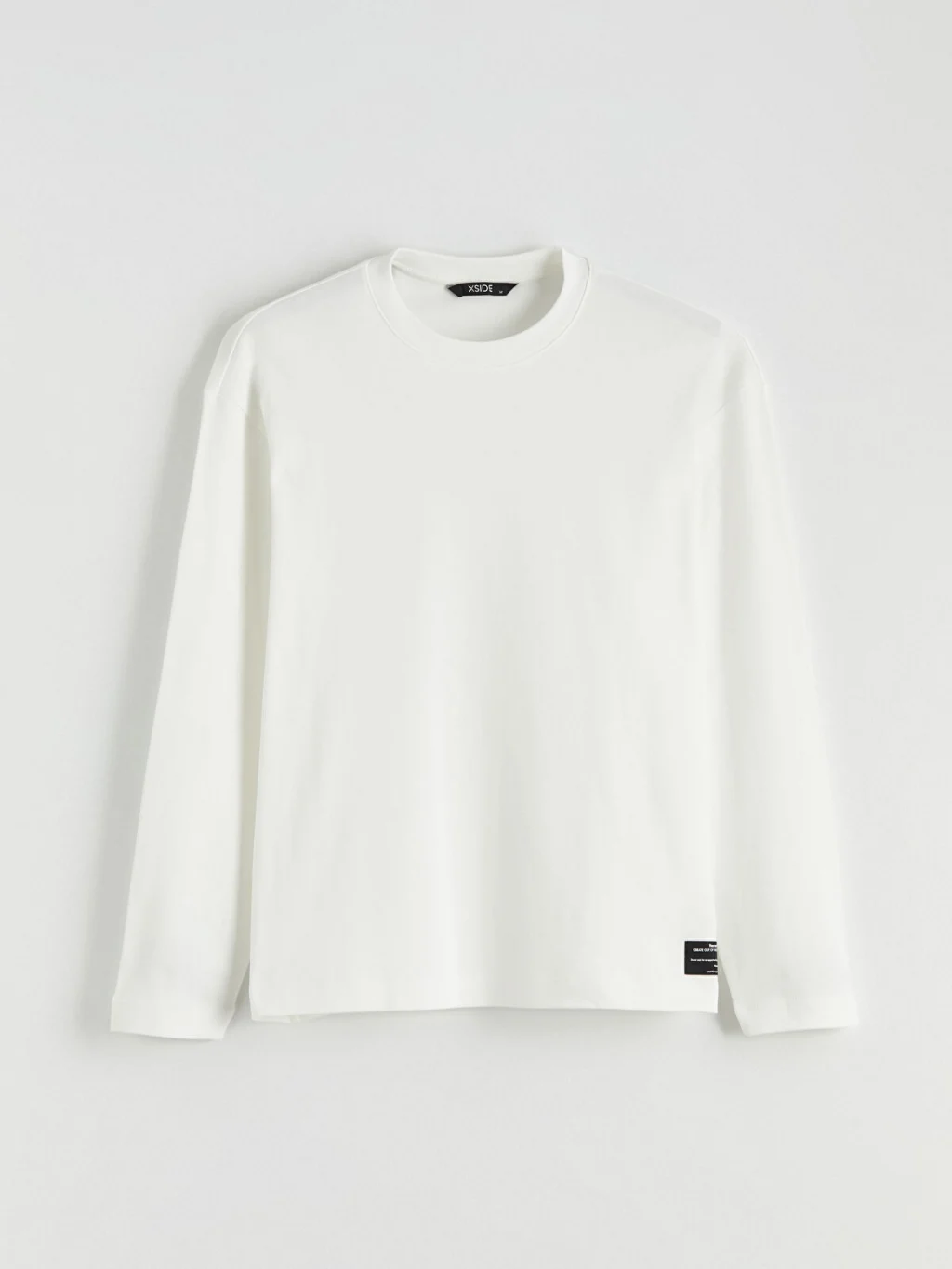 Bisiklet yaka ve uzun kollu erkek sweatshirt, %100 pamuk içerikli interlok kumaştan üretilmiştir. Etek ucunda etiket detayı bulunur.