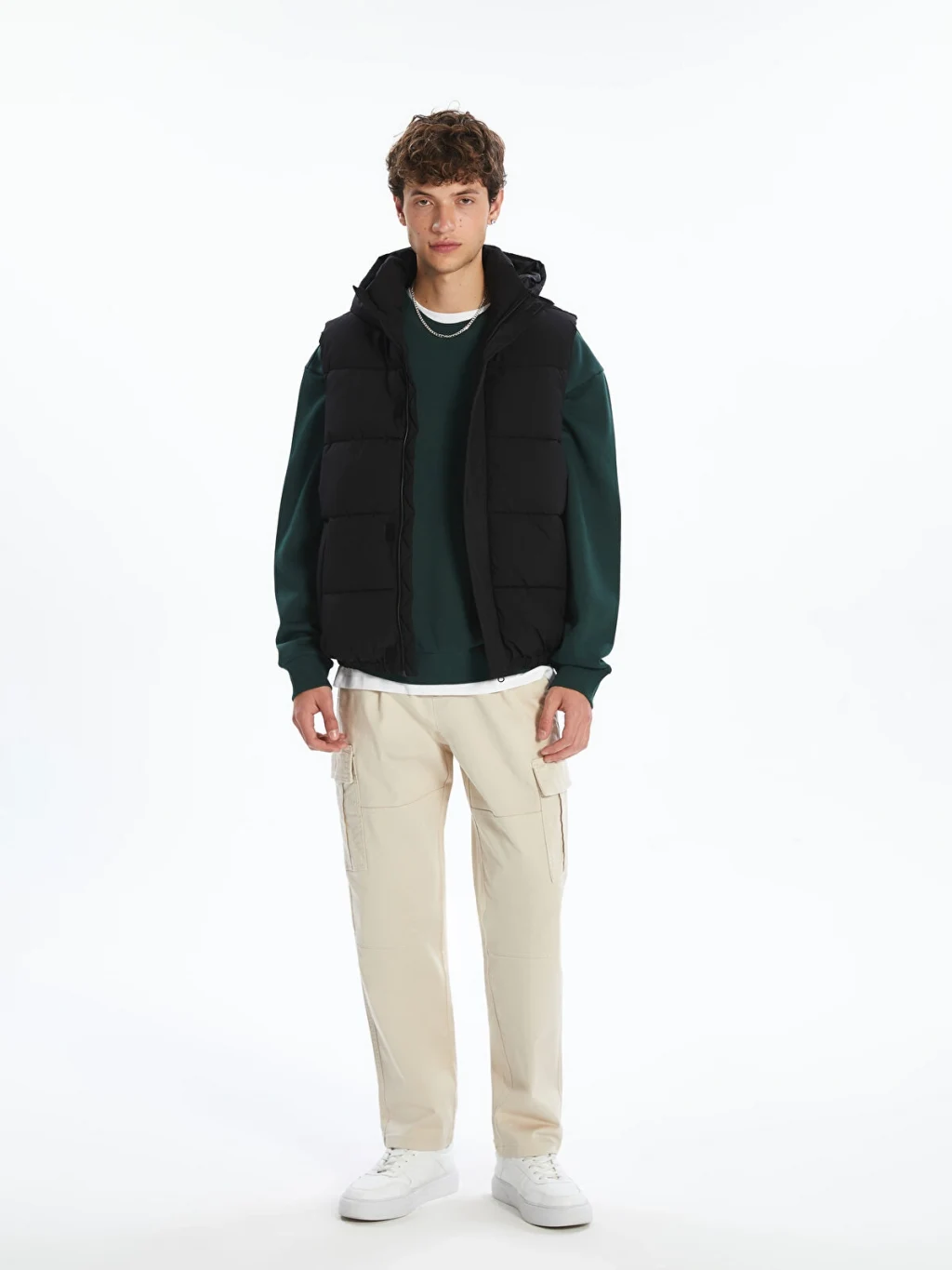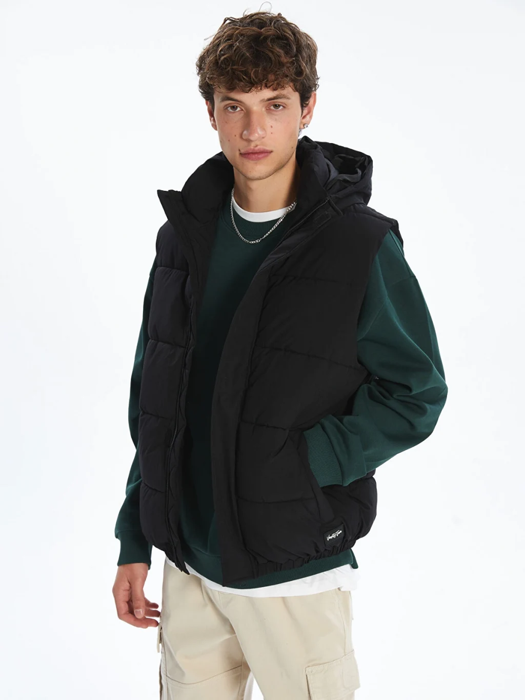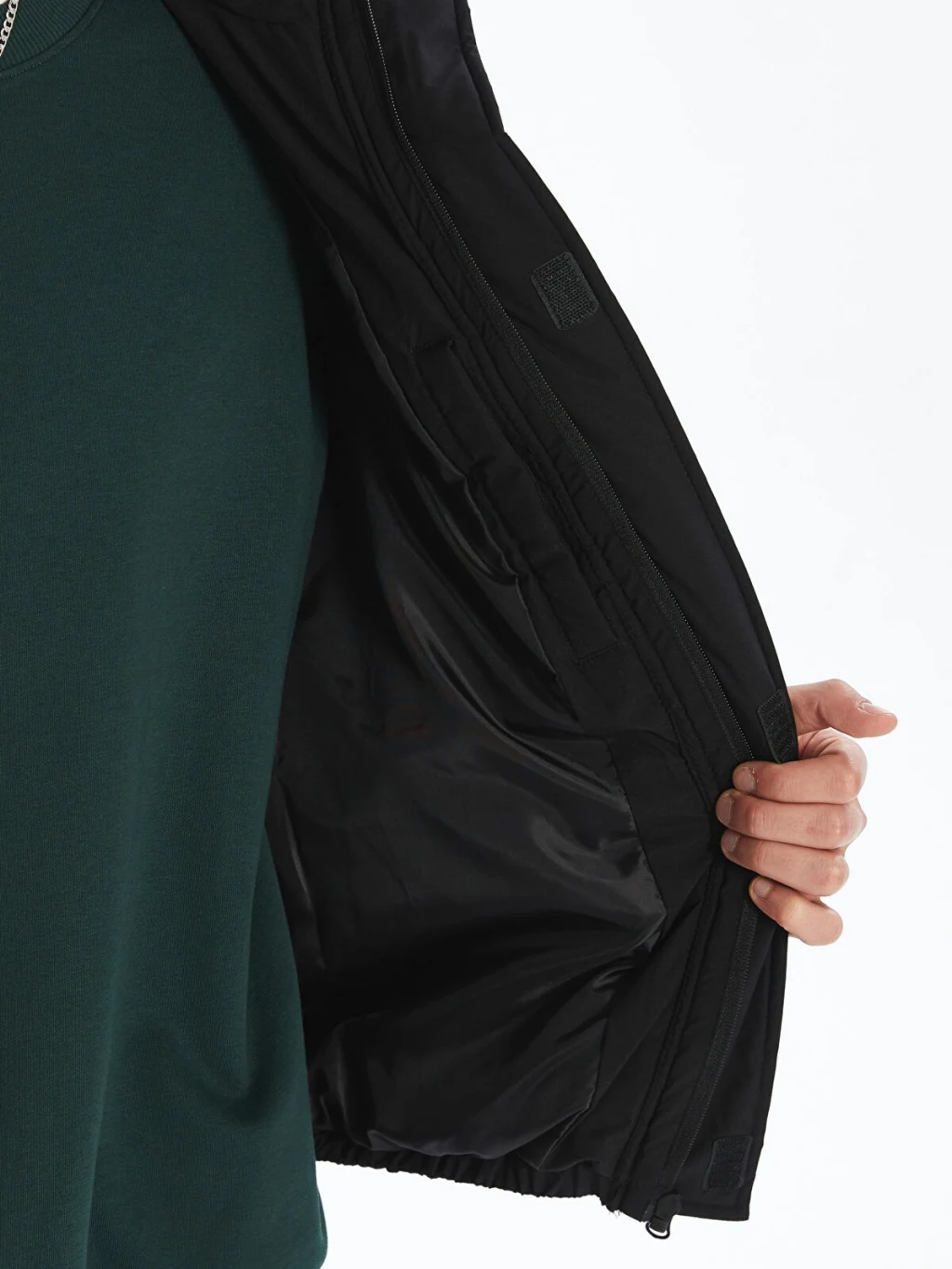 Erkek şişme yelek, kapüşonlu ve dik yakalıdır. Önü fermuar kapamalıdır ve yanlarda cepleri bulunur.