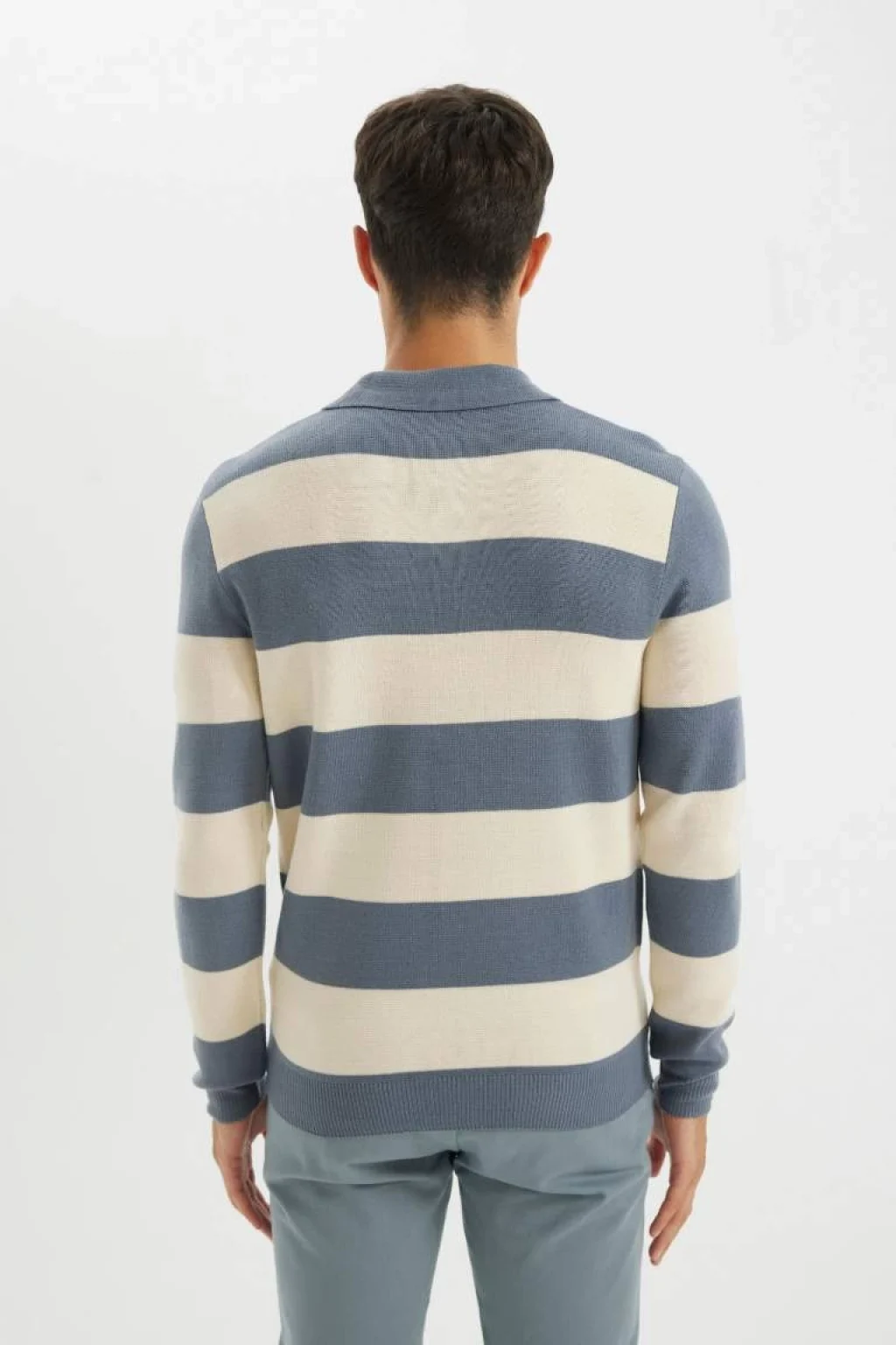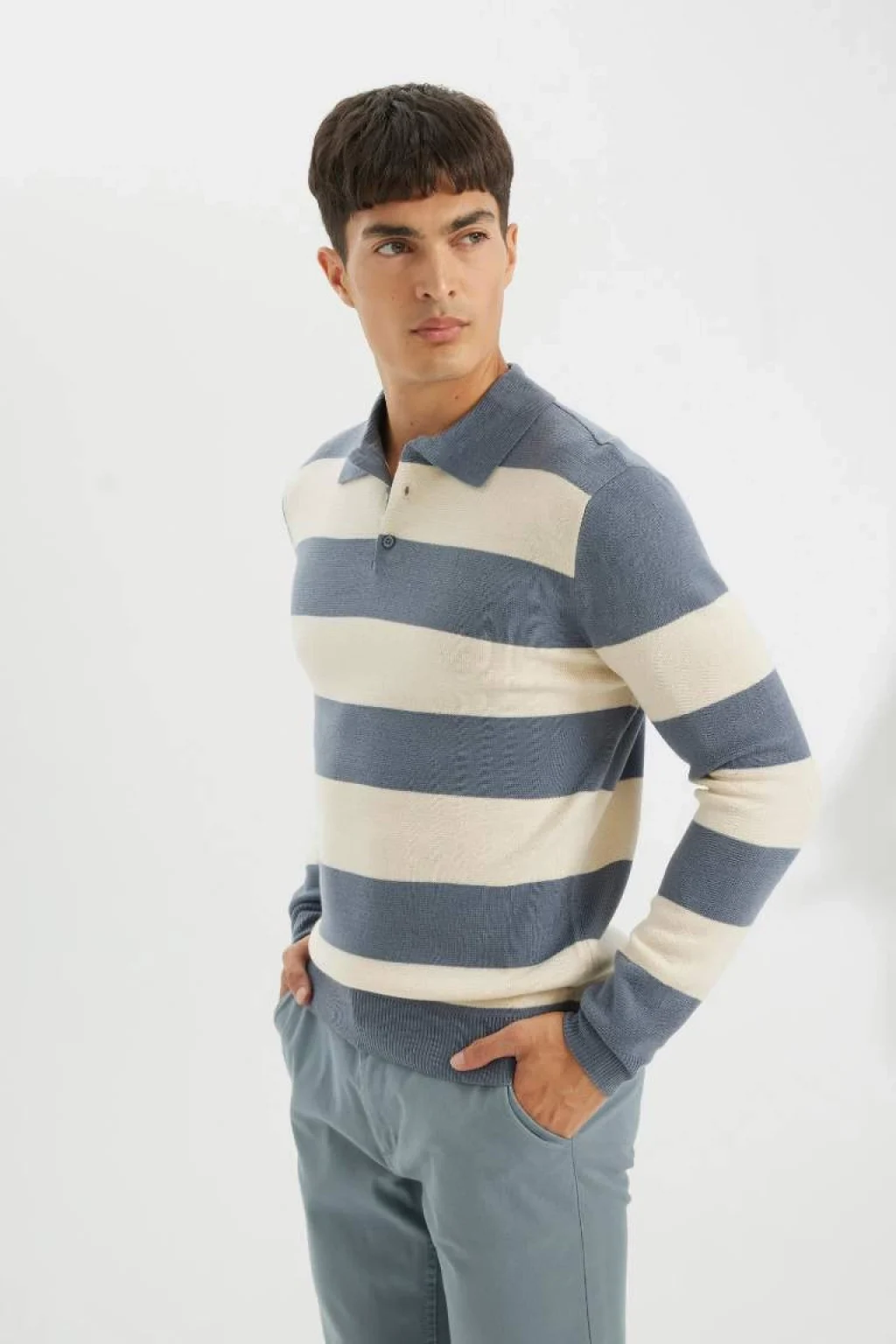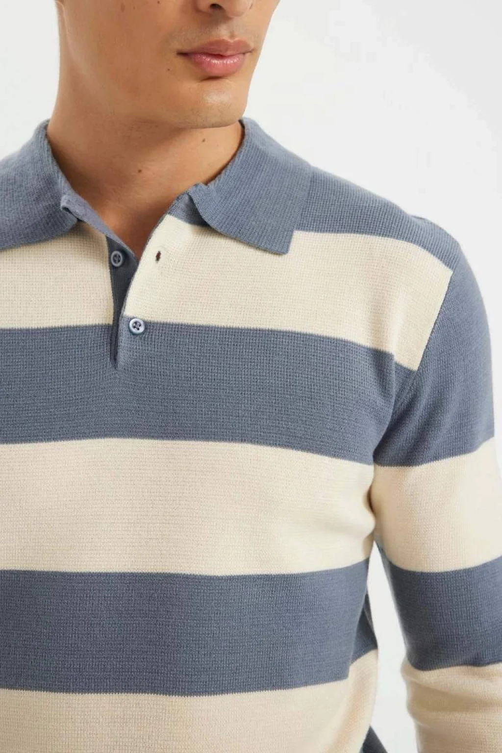 Y4194 Standart Fit Normal Kesim Çizgili Polo Yaka Triko Kazak