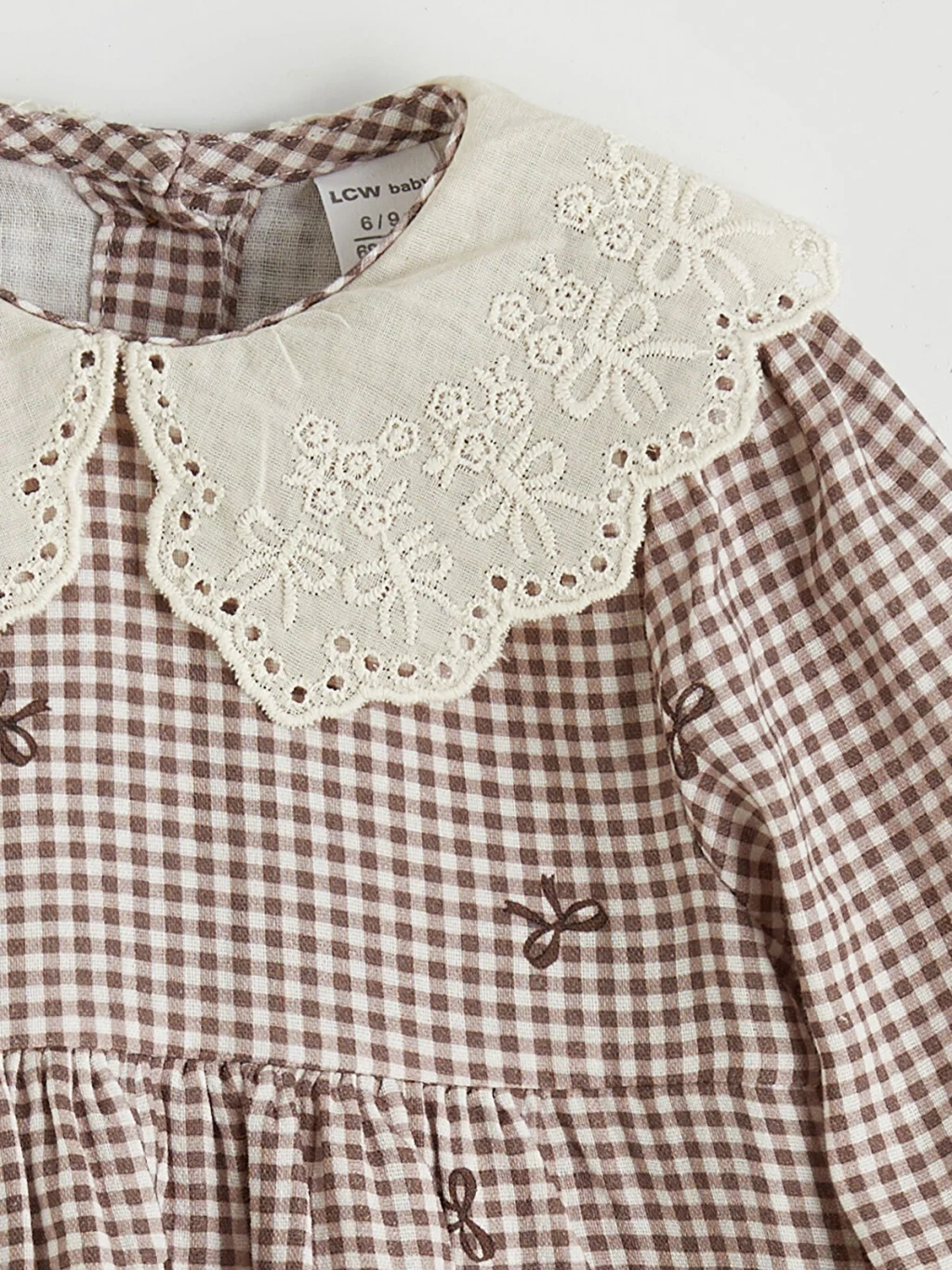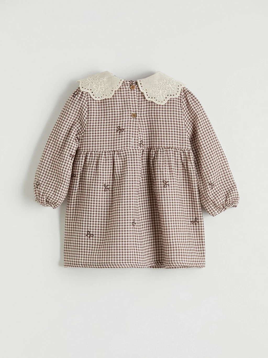Kız bebek elbise, %100 pamuk müslin kumaştan üretilmiştir. Pötikare desenli, fiyonk nakışlı, uzun kollu ve nakış işlemeli bebe yakalıdır.