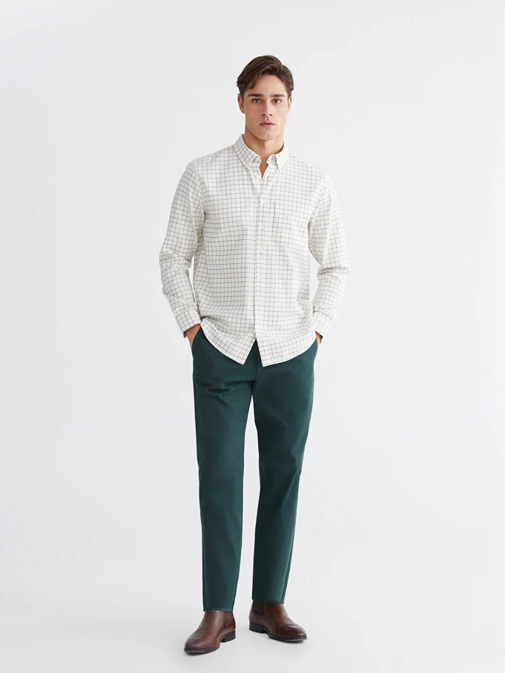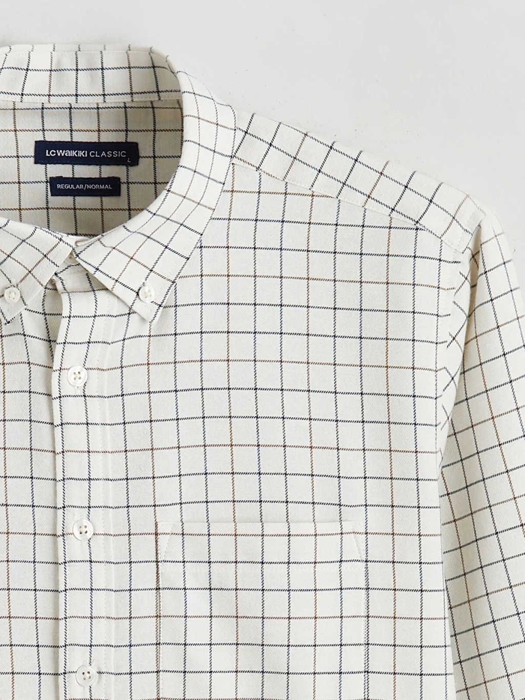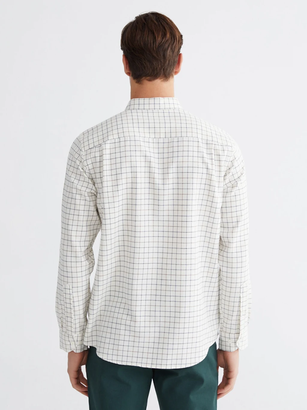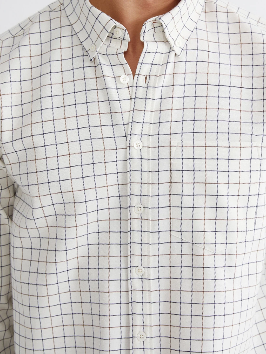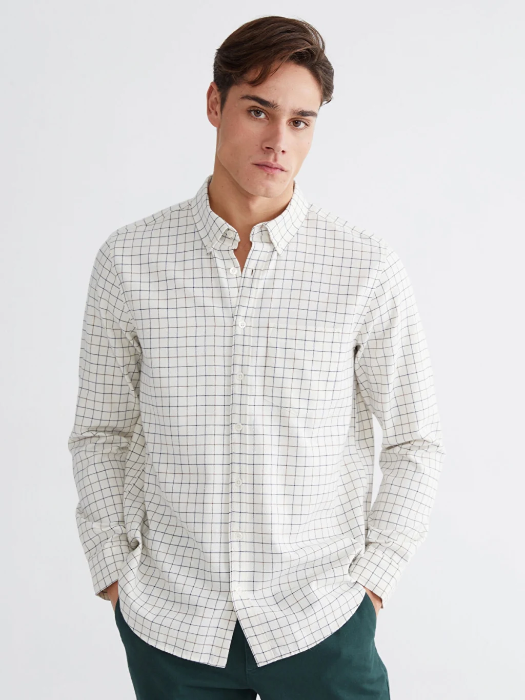 Uzun kollu ve kareli desenli erkek gömlek, düğmeli yakaya, önden düğme kapamaya ve tek göğüs cebine sahiptir.