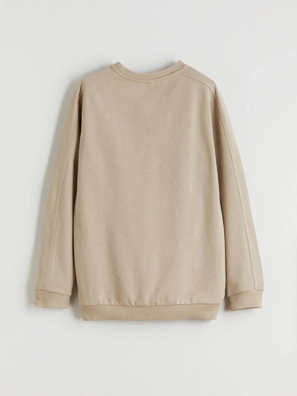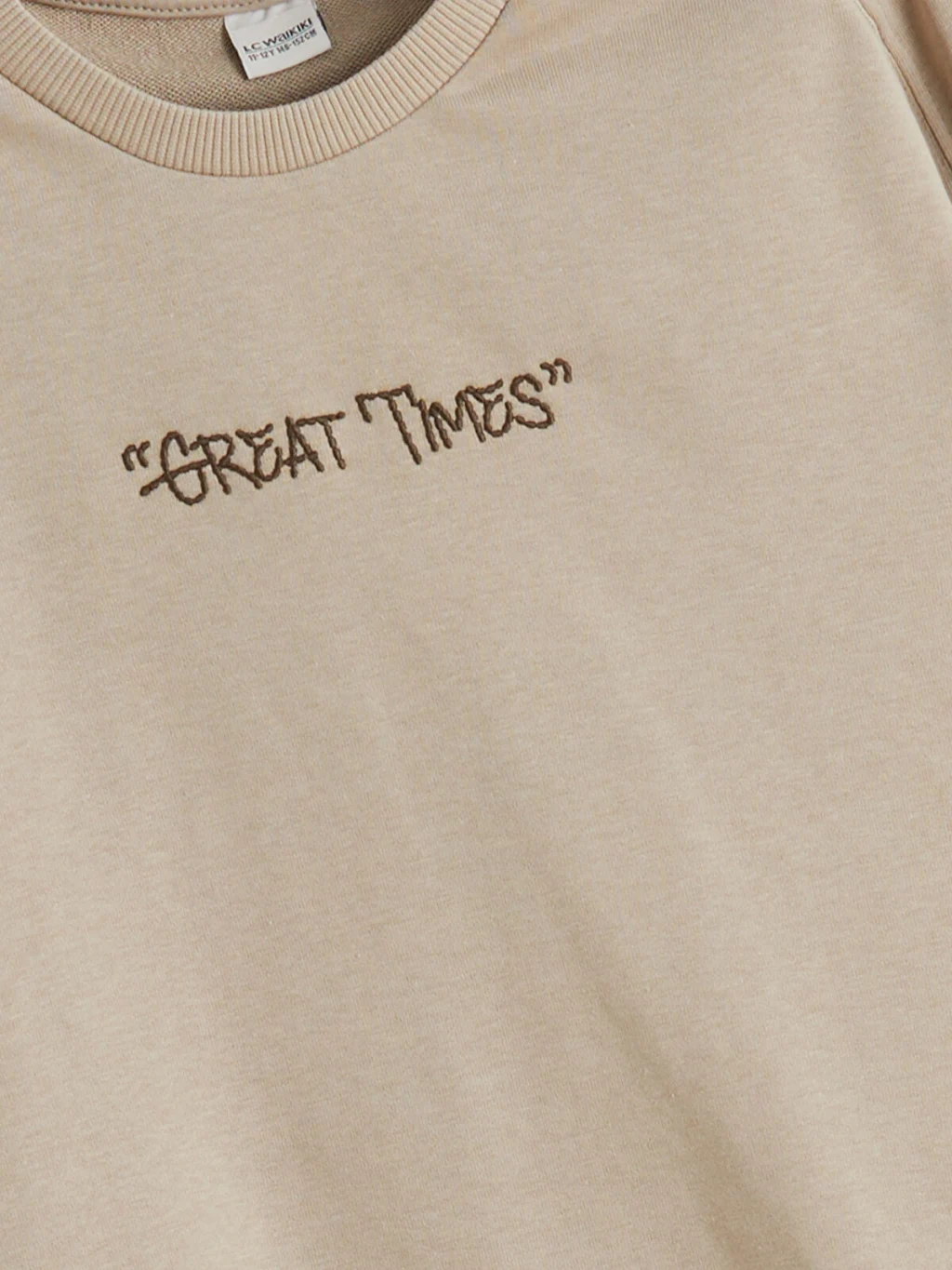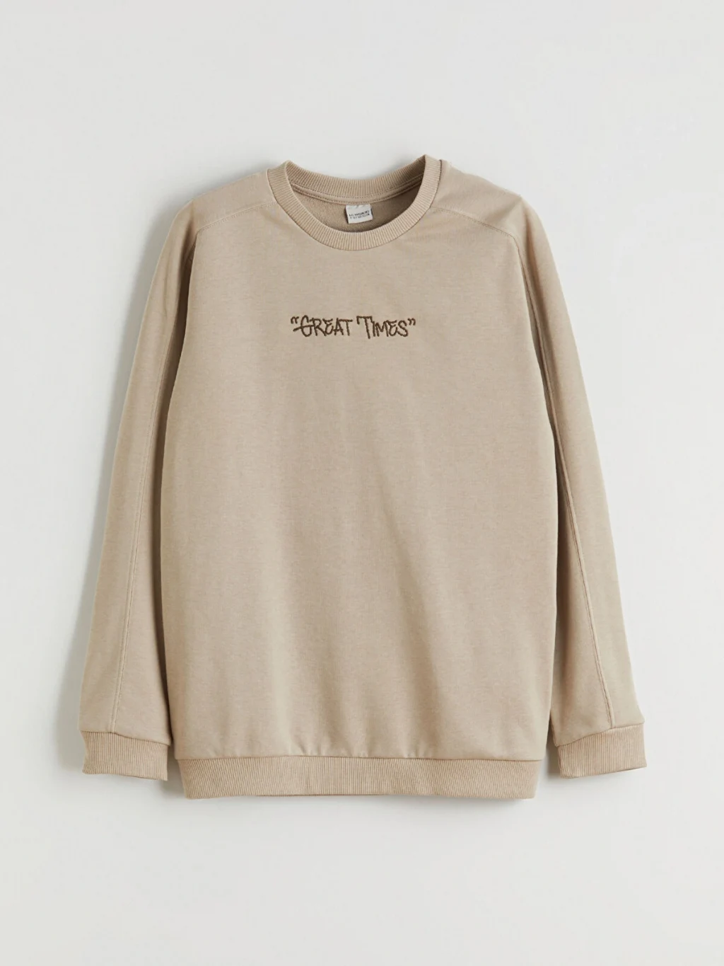 Erkek çocuk sweatshirt, bisiklet yaka ve uzun kolludur. Kalın 3 iplik kumaştan üretilmiştir. Önü yazılıdır, kol ve etek ucu ribanalıdır.