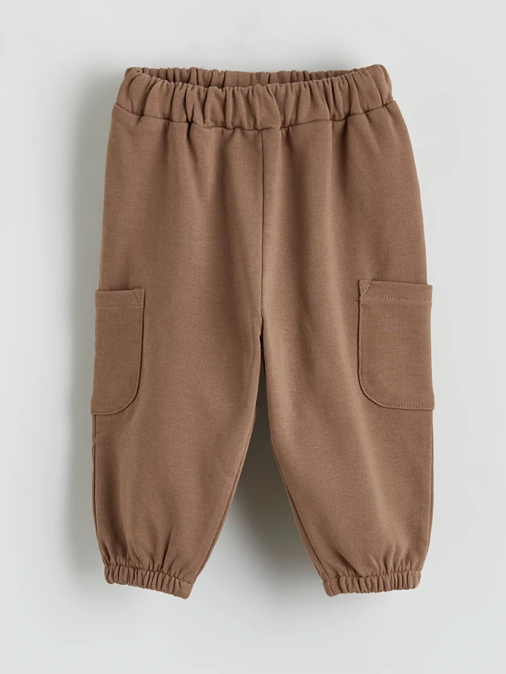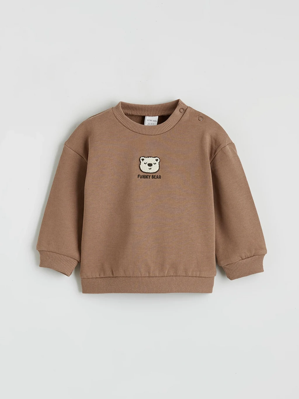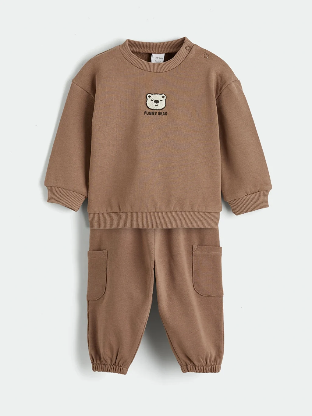 Erkek bebek takım, bisiklet yaka, omuzdan çıtçıt kapamalı, nakışlı sweatshirt ve kargo cepli, paçaları lastikli eşofman alttan oluşur.