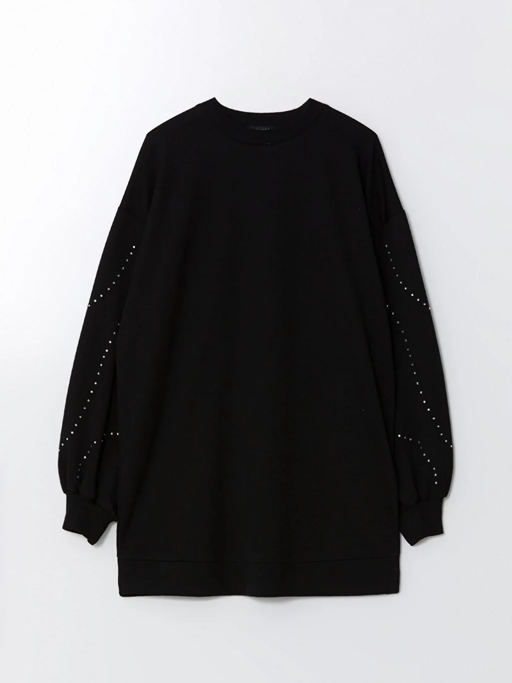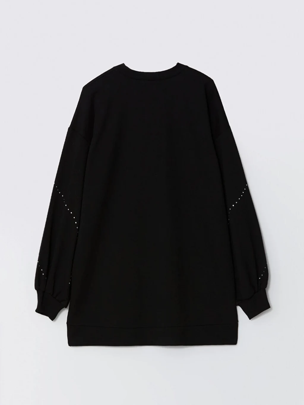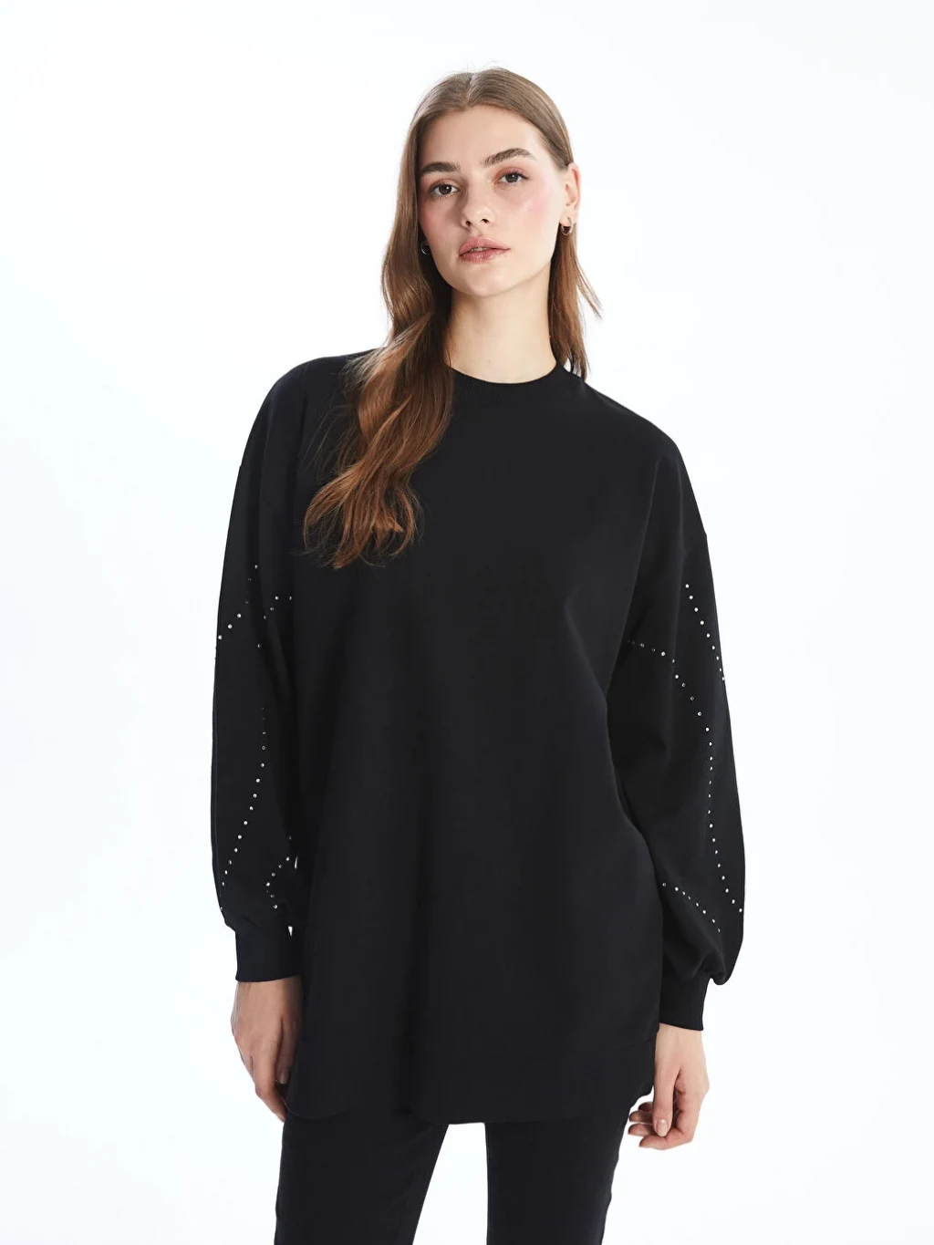 - Bisiklet yaka parlak taş baskılı oversize kadın sweatshirt tunik, iki iplik kumaşıyla yumuşak ve rahat bir kullanım sunar. Parlak taş baskılarıyla dikkat çeken tasarımı, şıklığı ve konforu bir arada sunar.