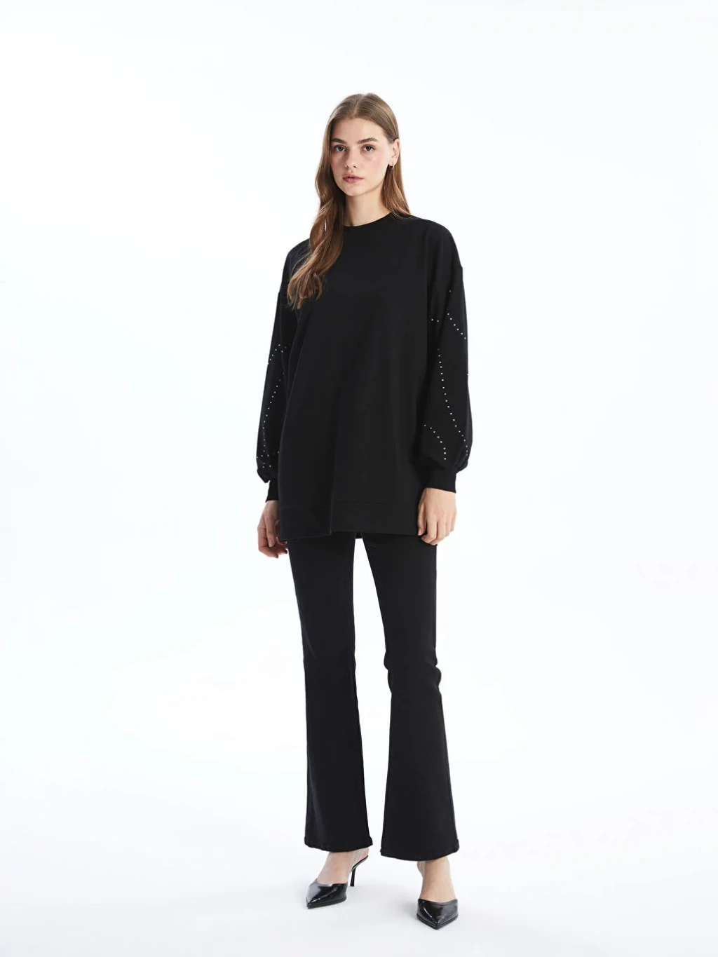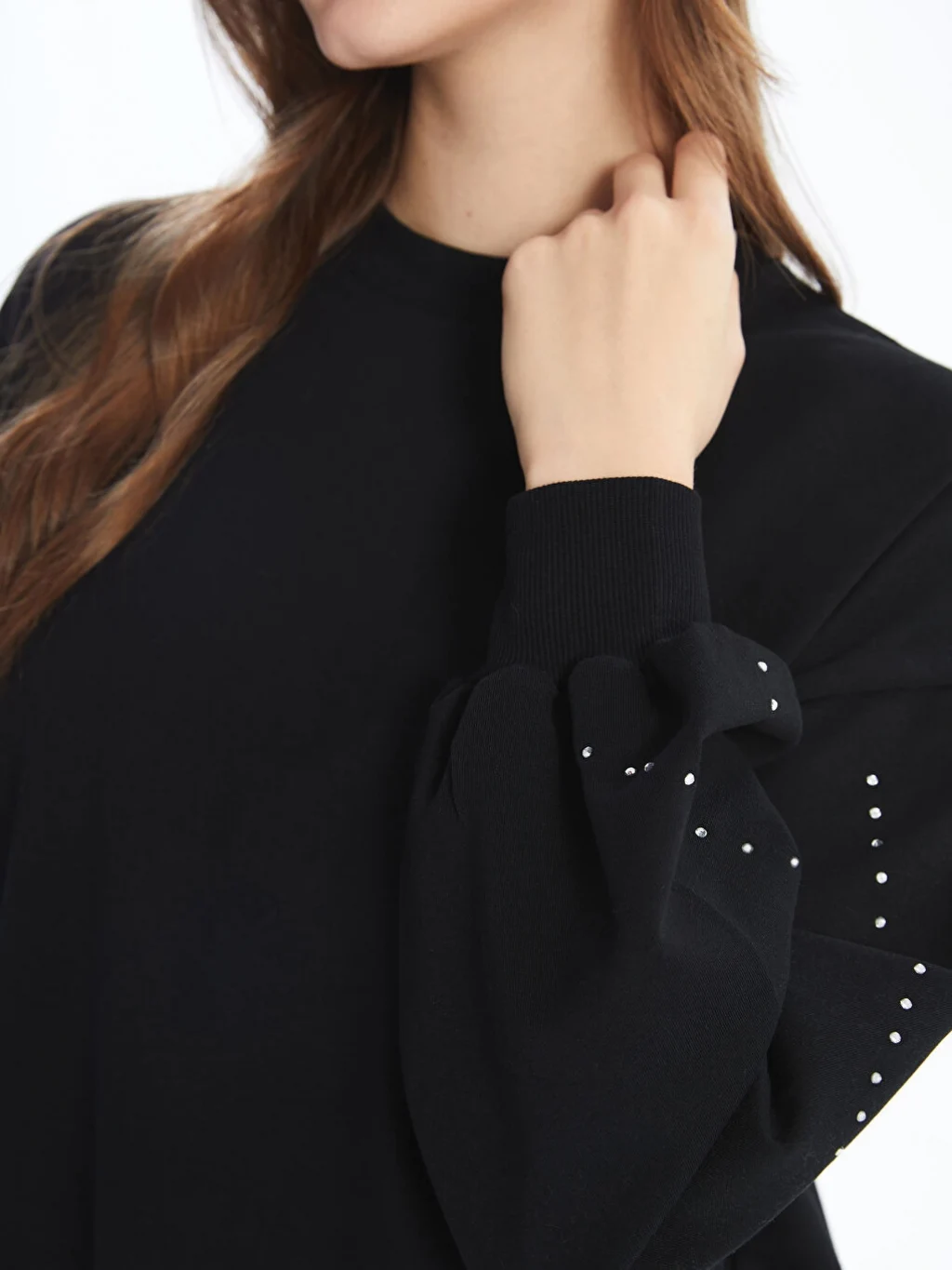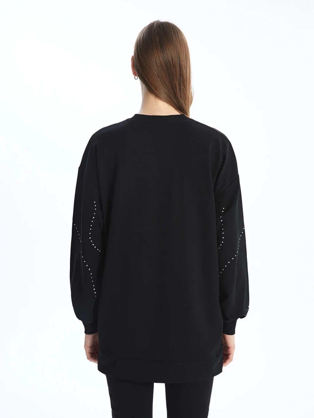 - Bisiklet yaka parlak taş baskılı oversize kadın sweatshirt tunik, iki iplik kumaşıyla yumuşak ve rahat bir kullanım sunar. Parlak taş baskılarıyla dikkat çeken tasarımı, şıklığı ve konforu bir arada sunar.