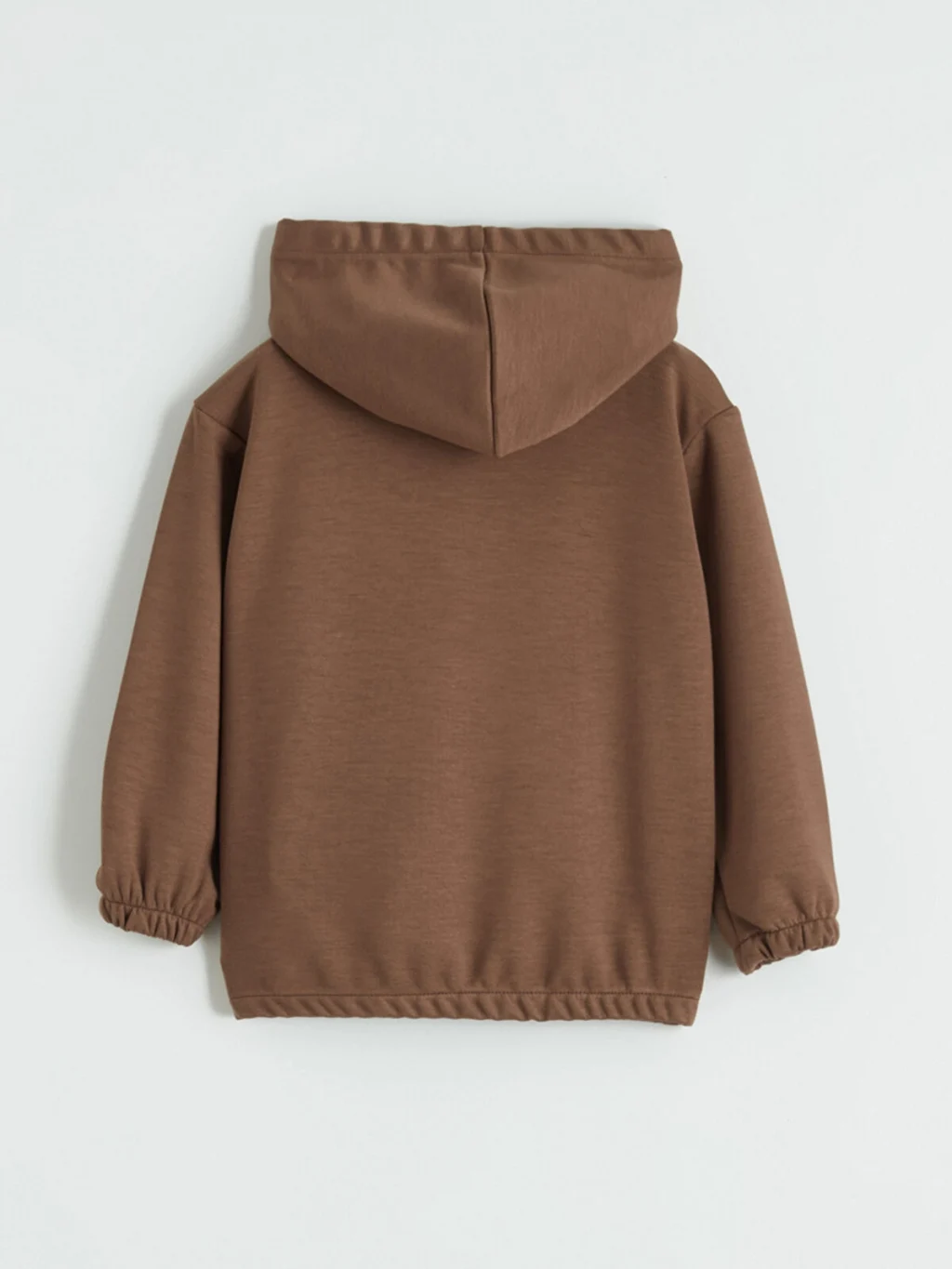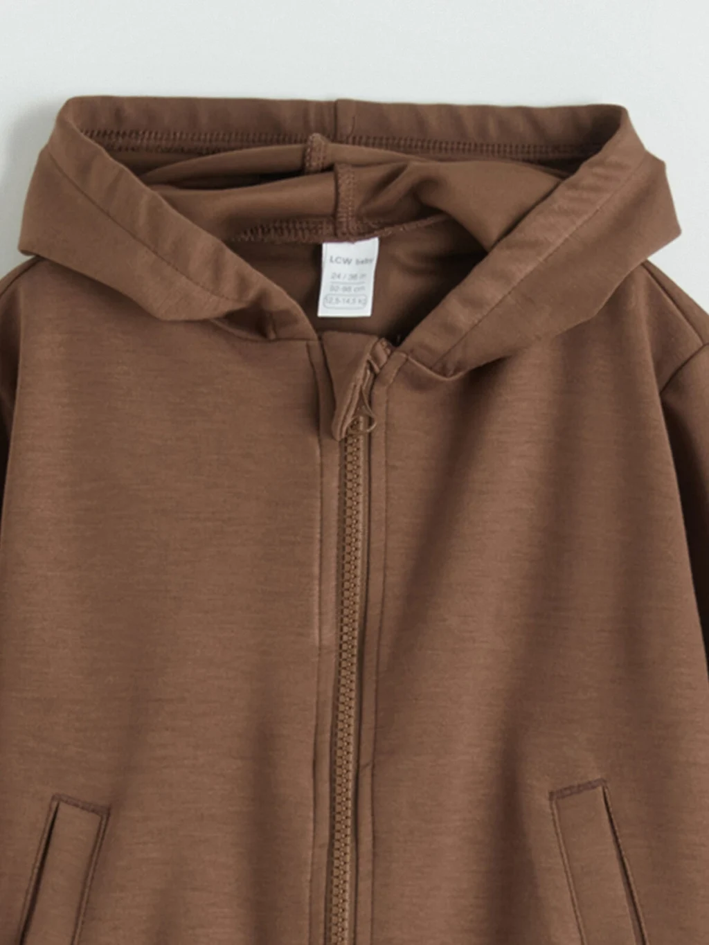İnterlok kumaştan üretilmiş erkek bebek eşofman takımı, kapüşonlu, uzun kollu, fermuar kapamalı sweatshirt ve eşofman alttan oluşur.