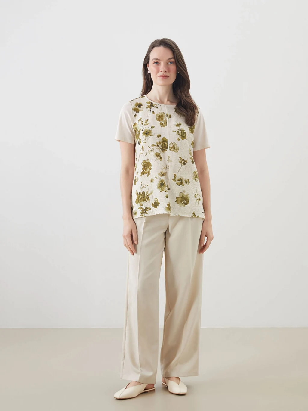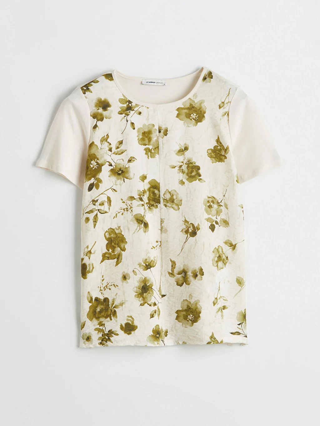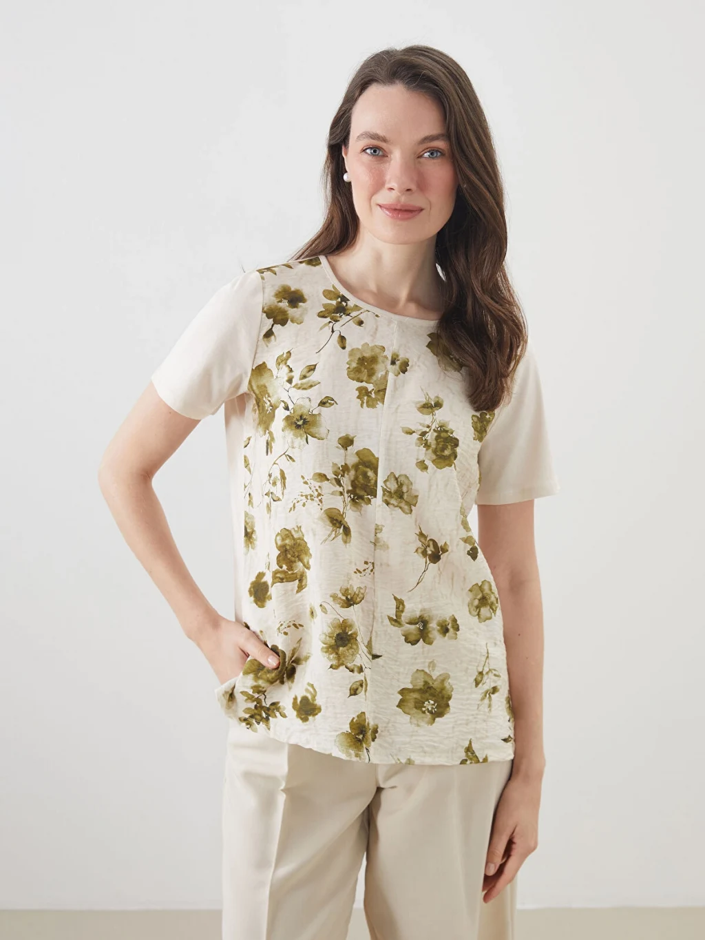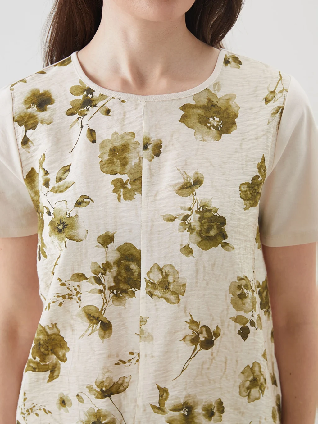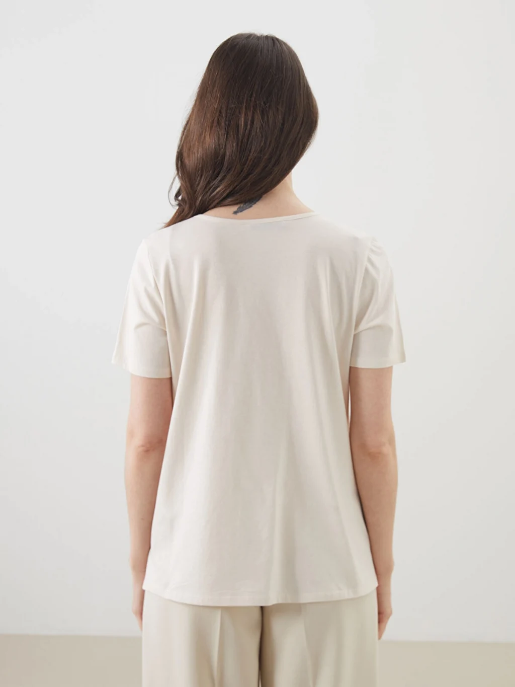 Bisiklet yaka kısa kollu kadın bluz, %100 pamuklu kumaştan üretilmiştir.