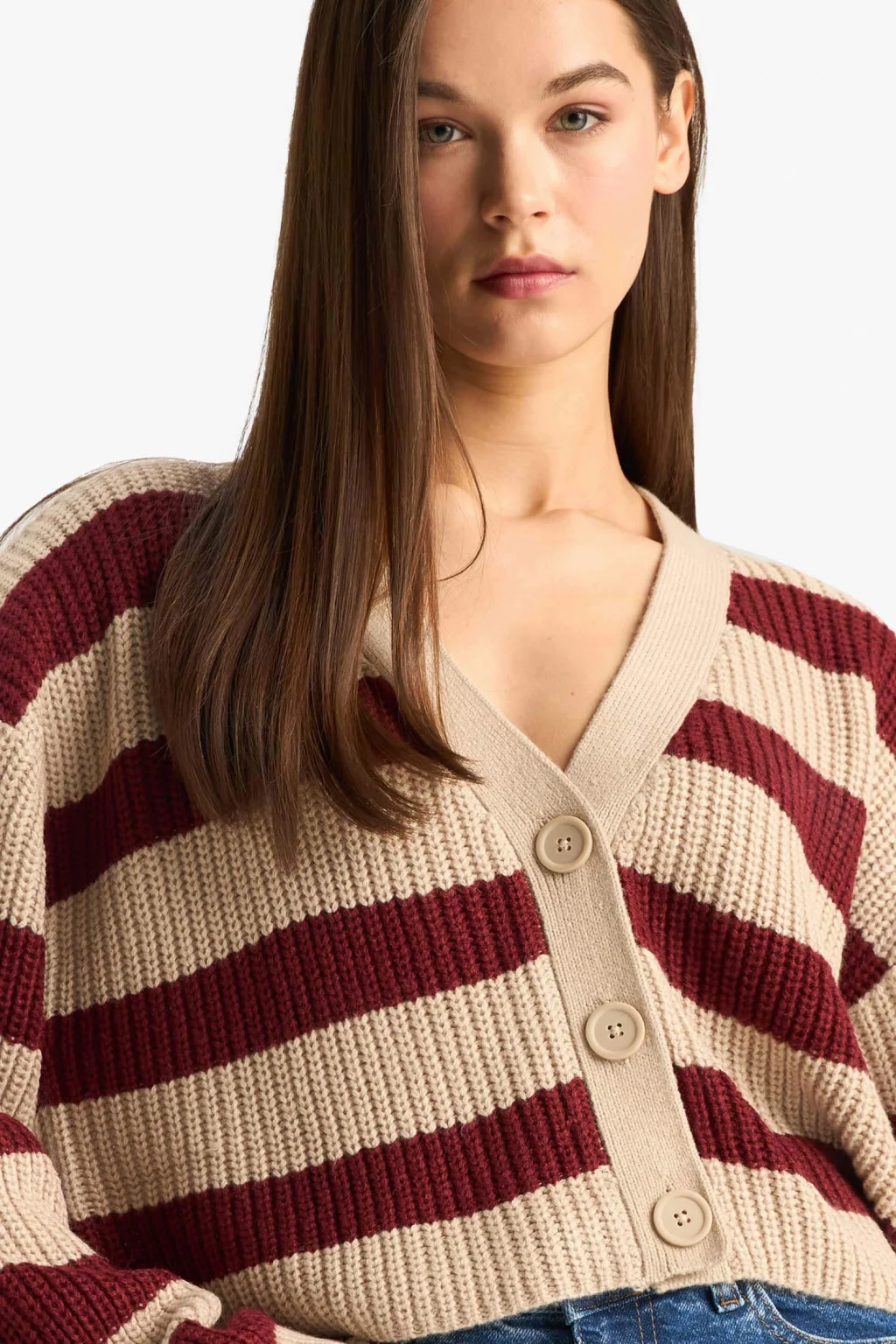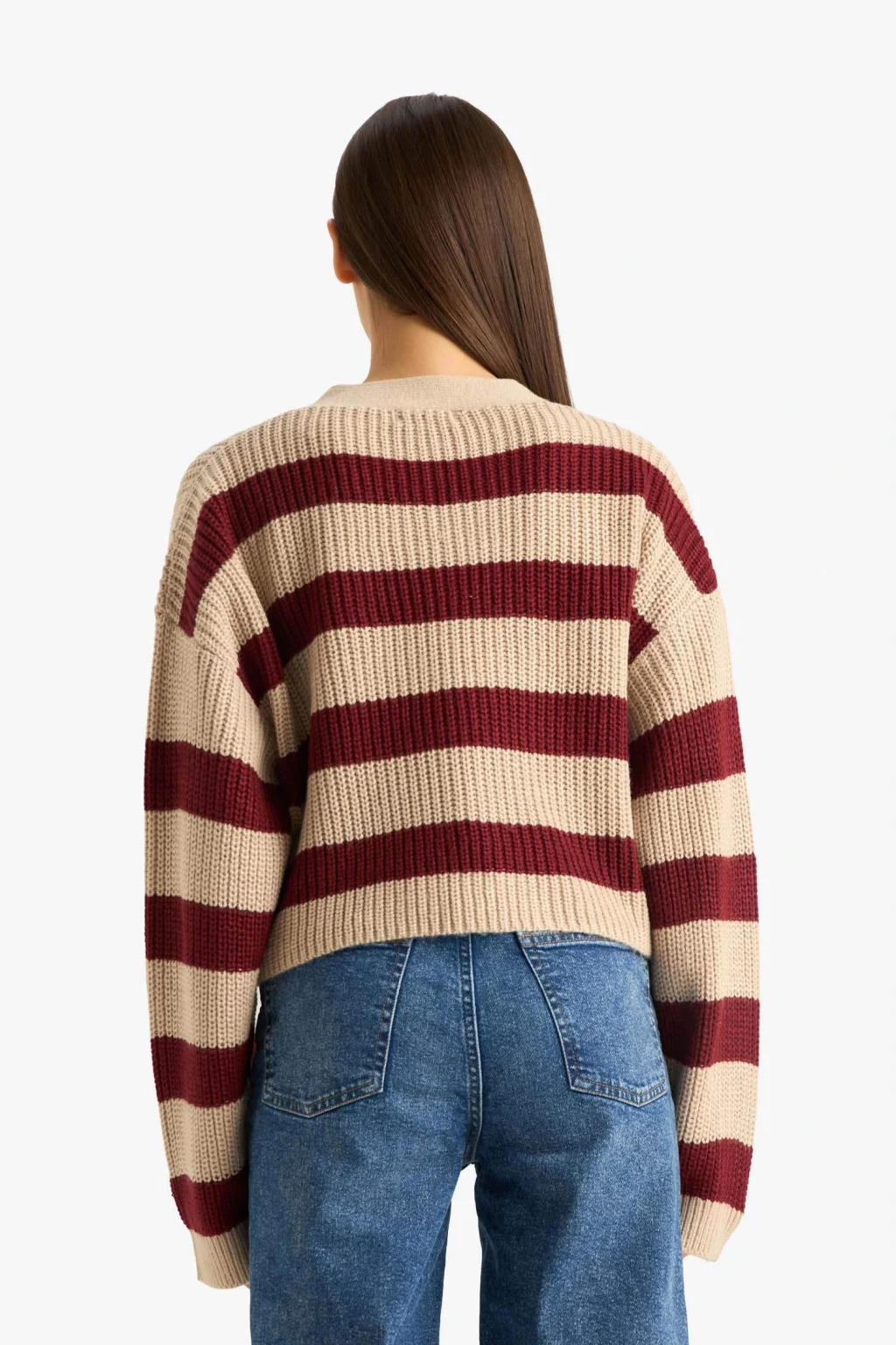V yaka tasarımı ve şık çizgili deseniyle öne çıkan bu regular fit triko hırka, hem klasik hem modern stillere uyum sağlar. Yumuşak dokusu sayesinde gün boyu konfor sunar ve serin havalarda ideal bir tamamlayıcıdır.