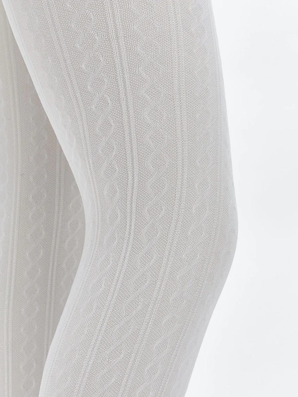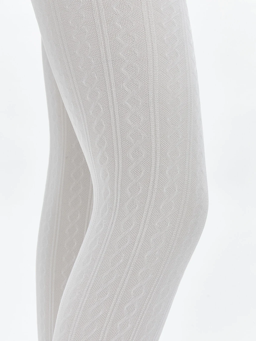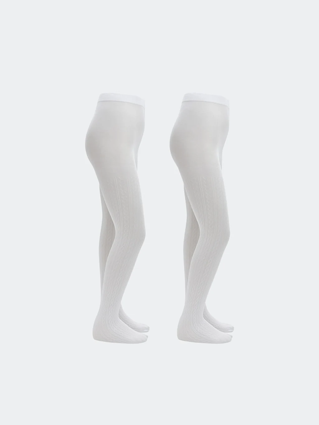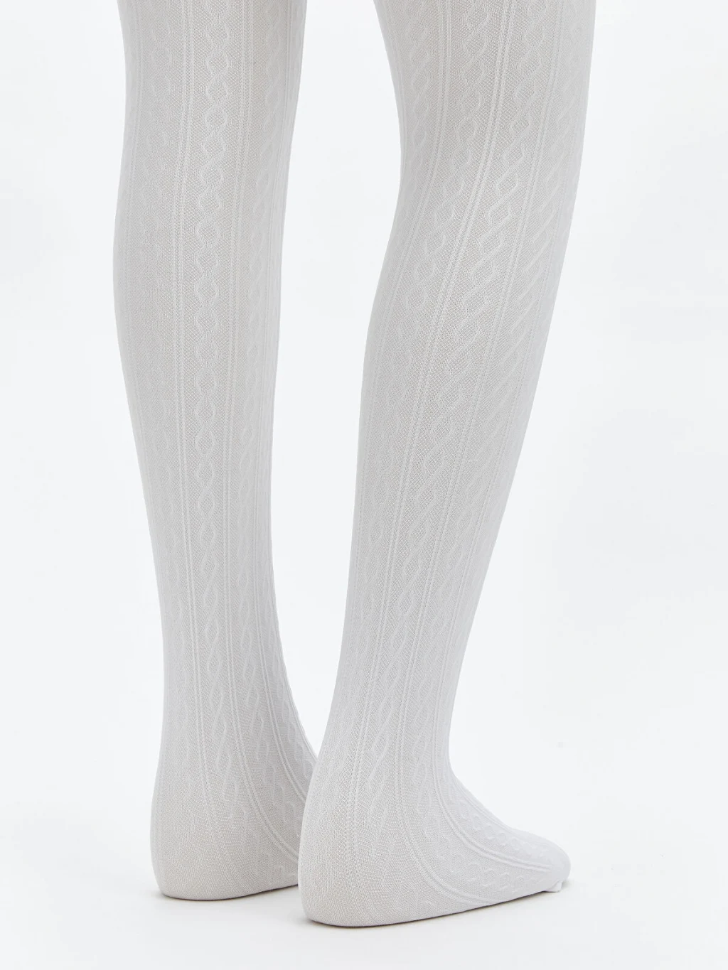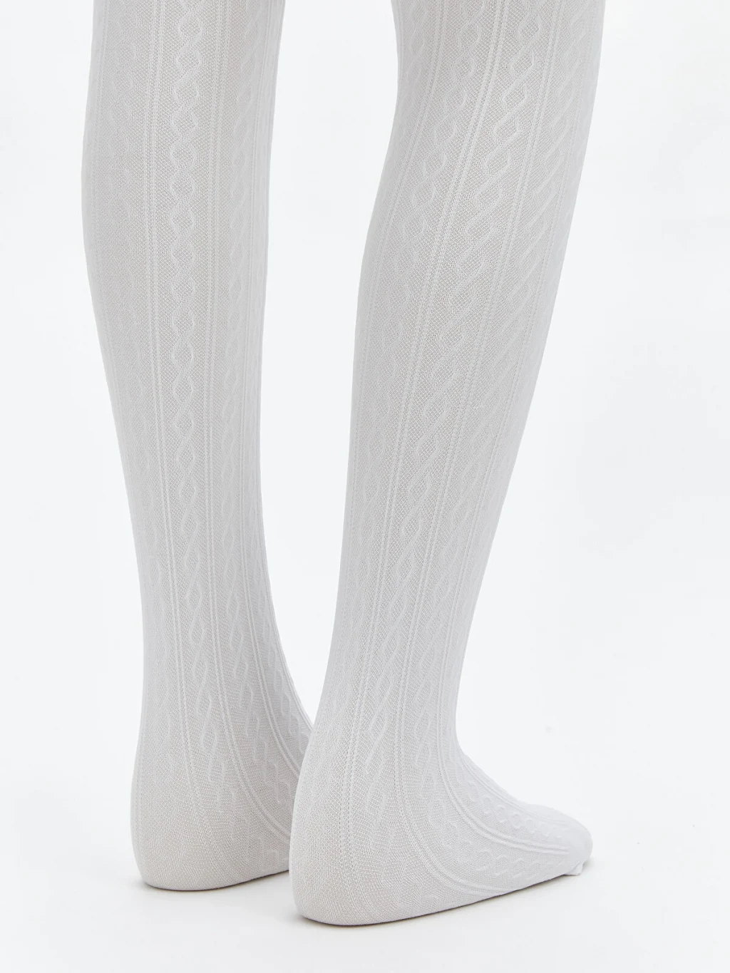 Kız çocuk külotlu çorap; elastik bel bandına ve boydan boya devam eden dokulu bir desene sahiptir.