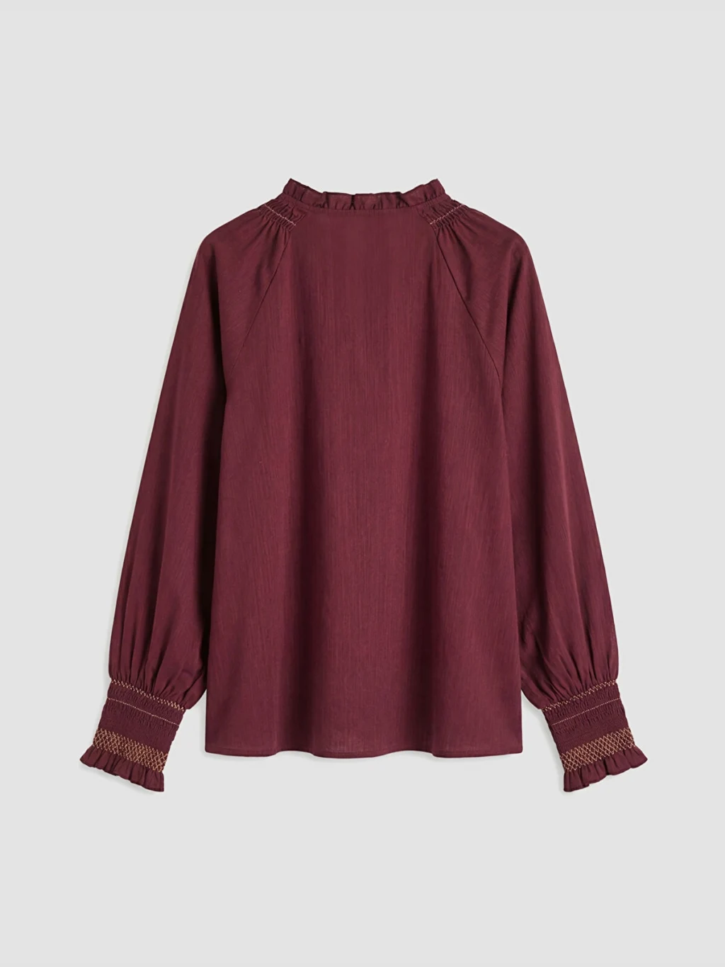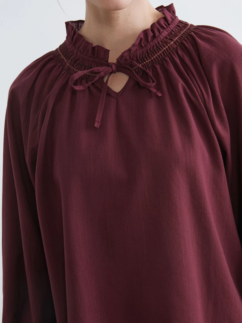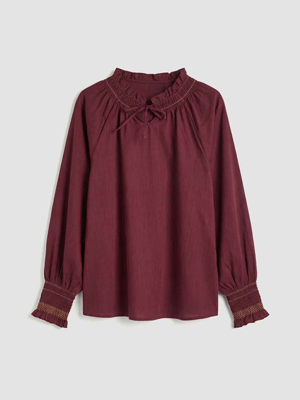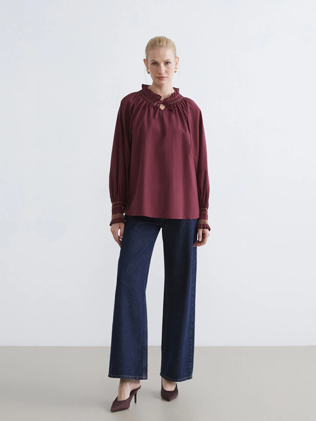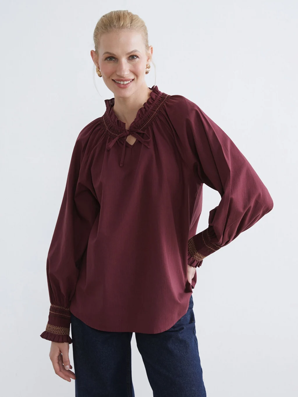 Yakası bağlama detaylı ve gipeli olan kadın bluz, uzun kolludur ve kol manşetleri de gipelidir.