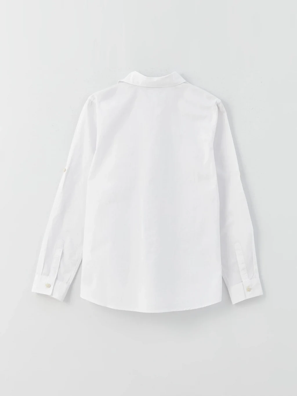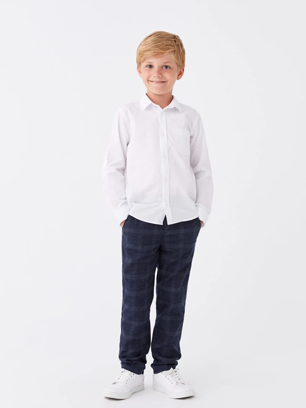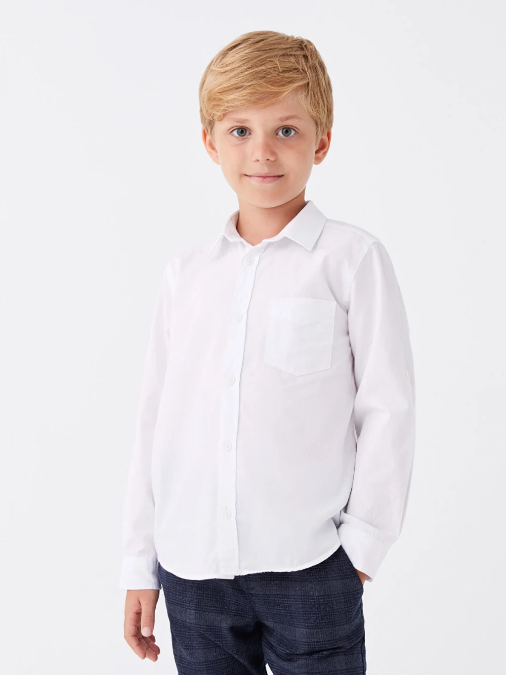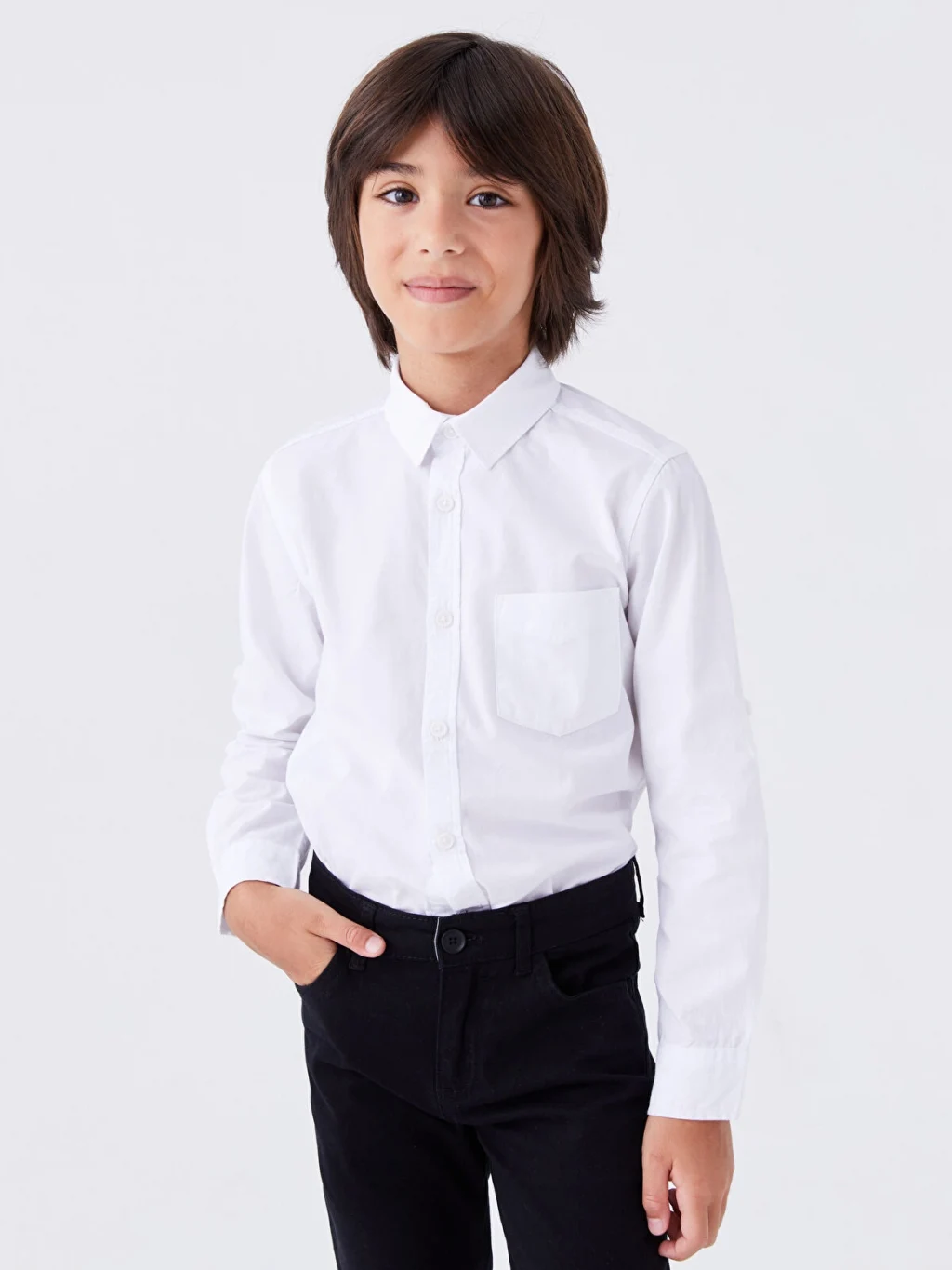 %100 pamuklu poplin kumaştan üretilen erkek çocuk gömlek, gömlek yakalı ve uzun kolludur. Önden düğme kapamalıdır ve tek göğüs cebi bulunur.
