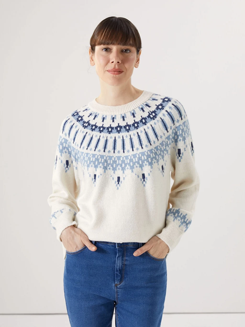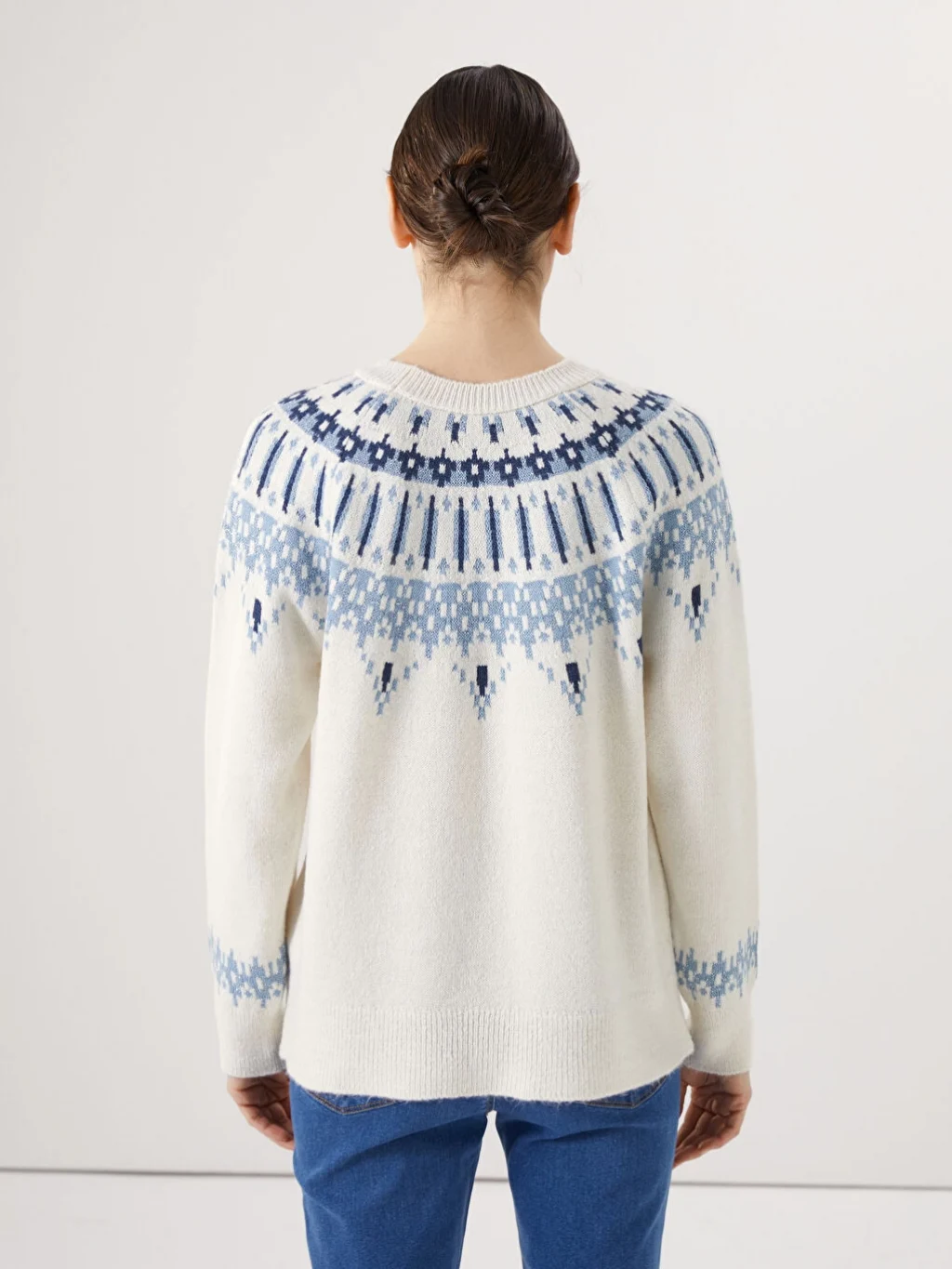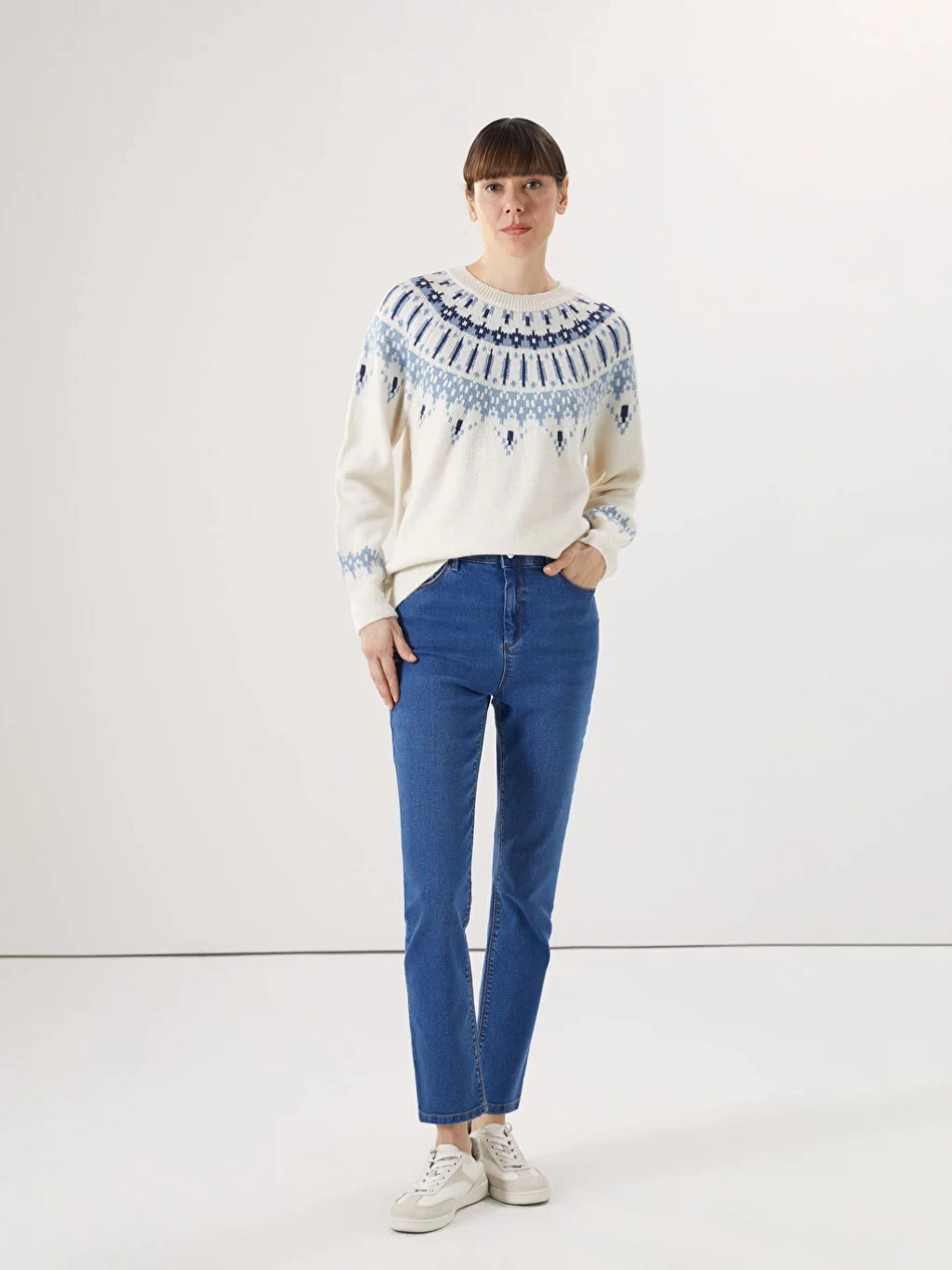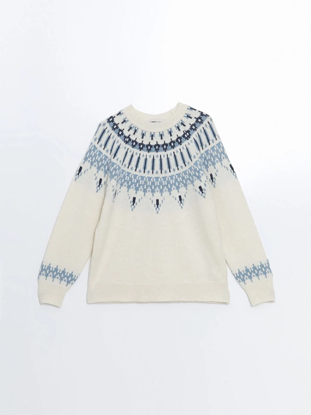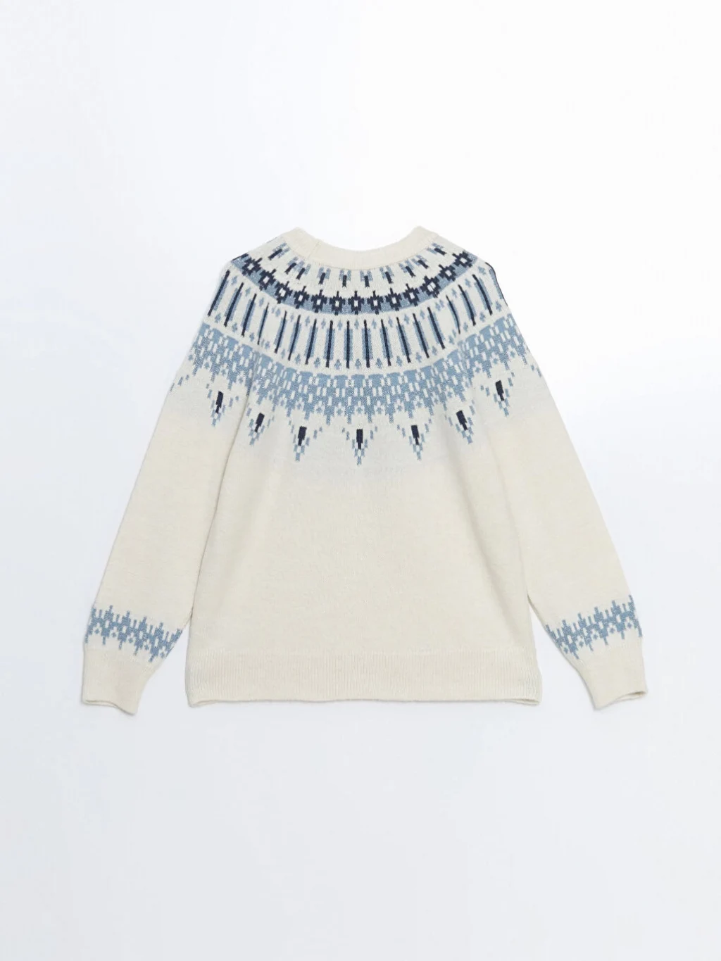 Bisiklet yakalı, desenli tasarımıyla kadın triko kazak, soğuk günler için ideal bir seçimdir. Uzun kolları ve triko kumaşıyla konforlu bir giyim deneyimi sunar. Hem günlük hem de özel günlerde tercih edebilirsiniz.